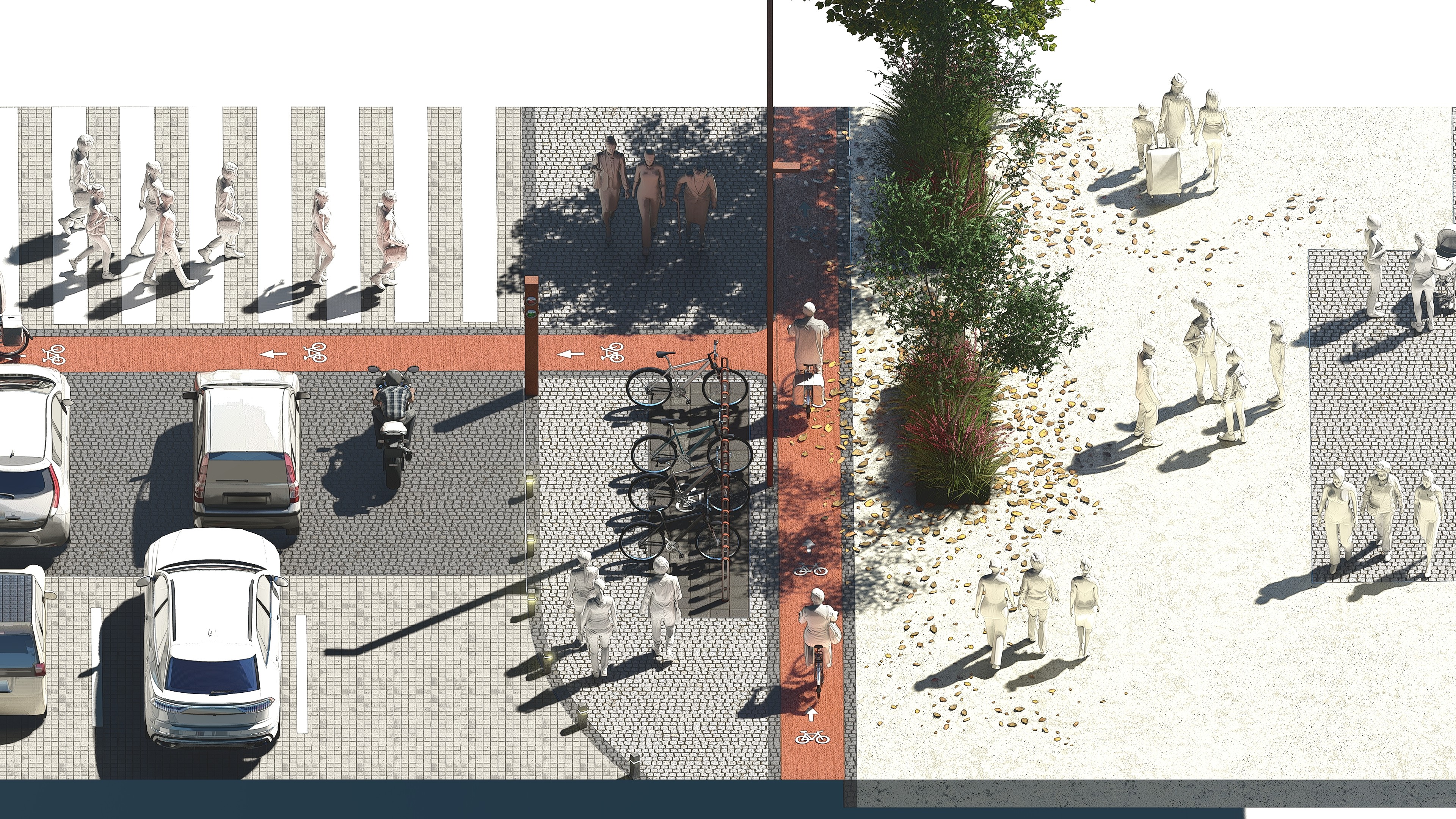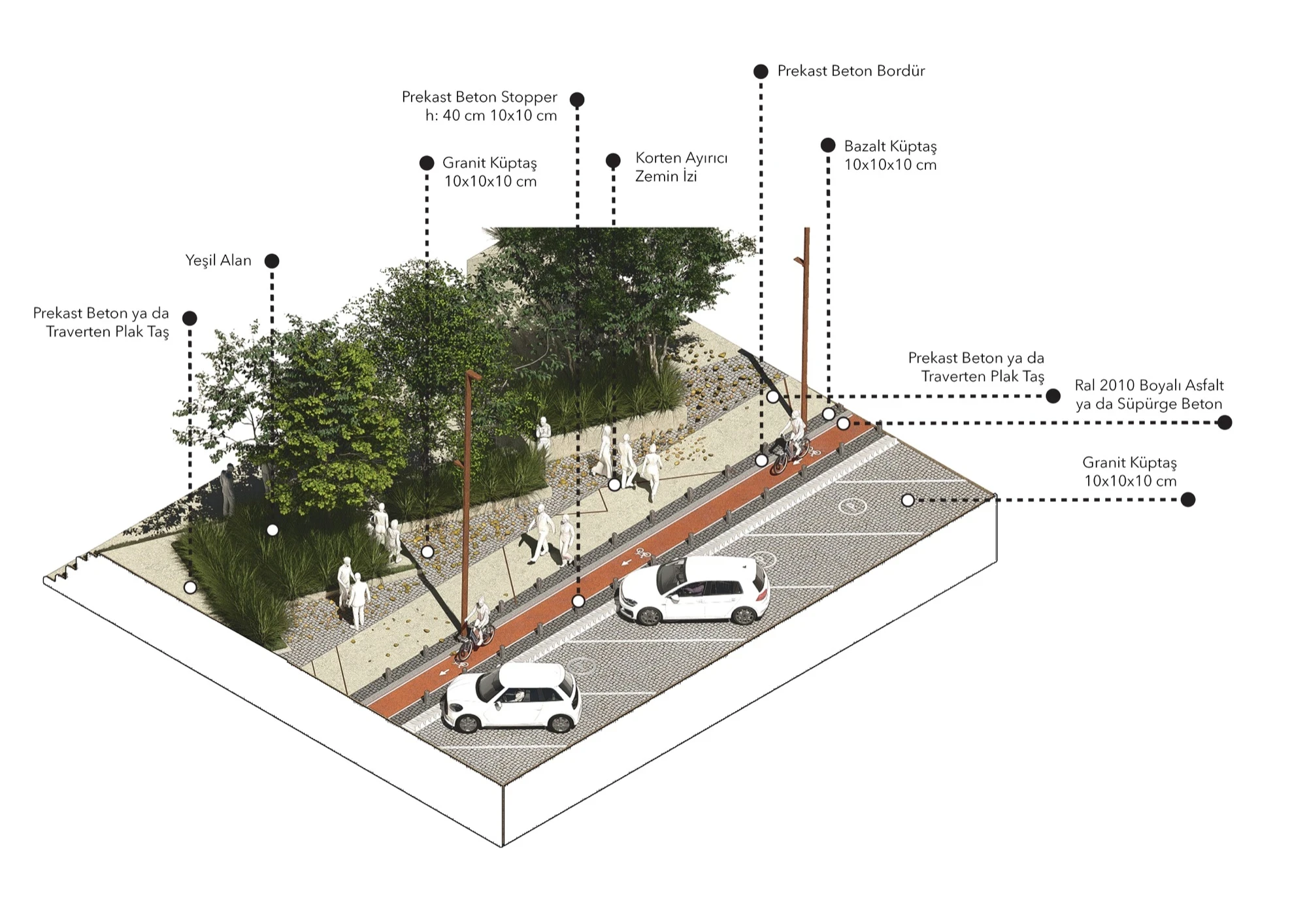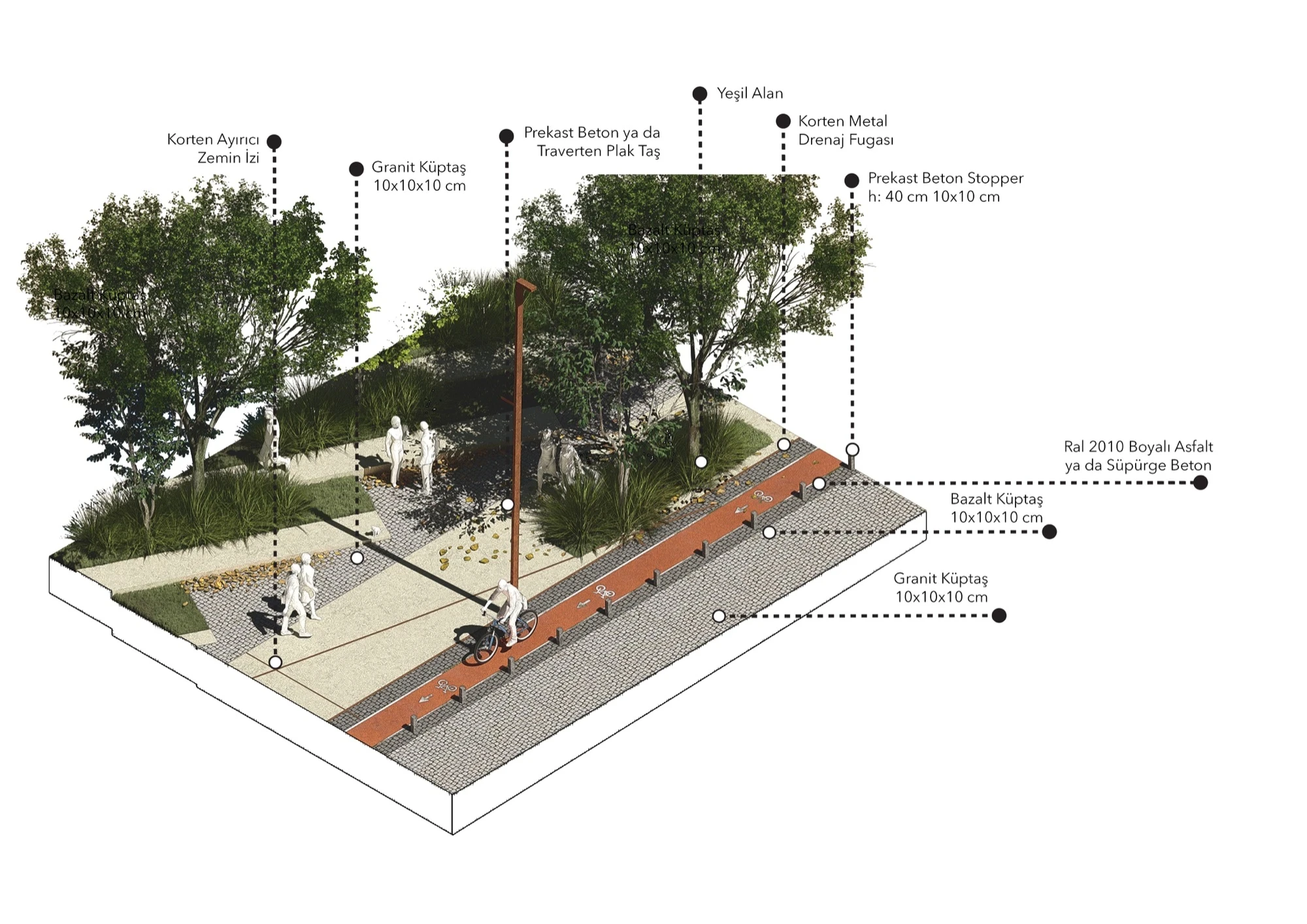 Existing trees on the street were preserved and a vegetative texture with minimal water needs was designed. At the same time, the cyclist and pedestrian arrangement was continued along the entire street.The typologies on the entire street were studied separately and the texture structure was organized in the historical area.