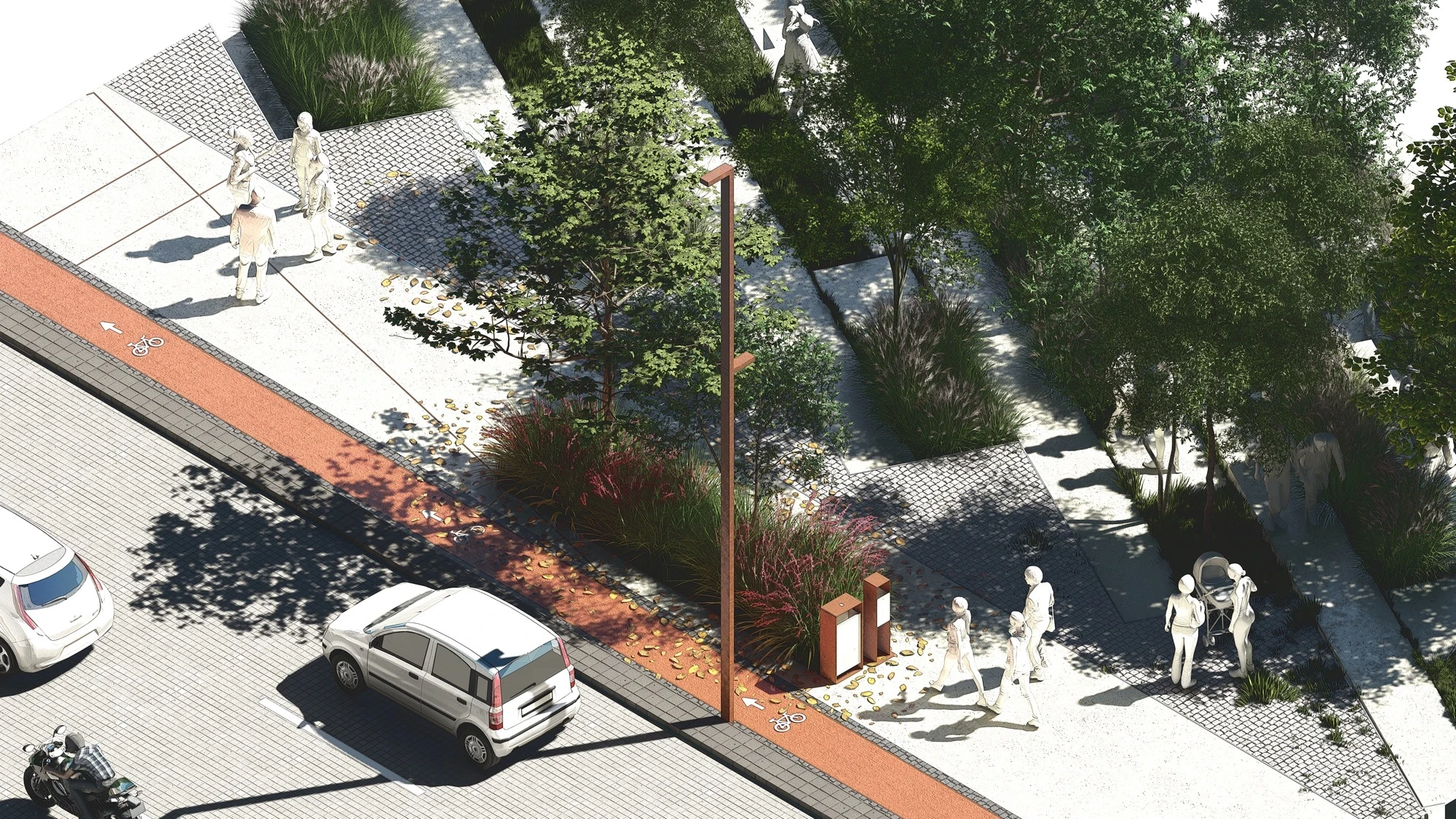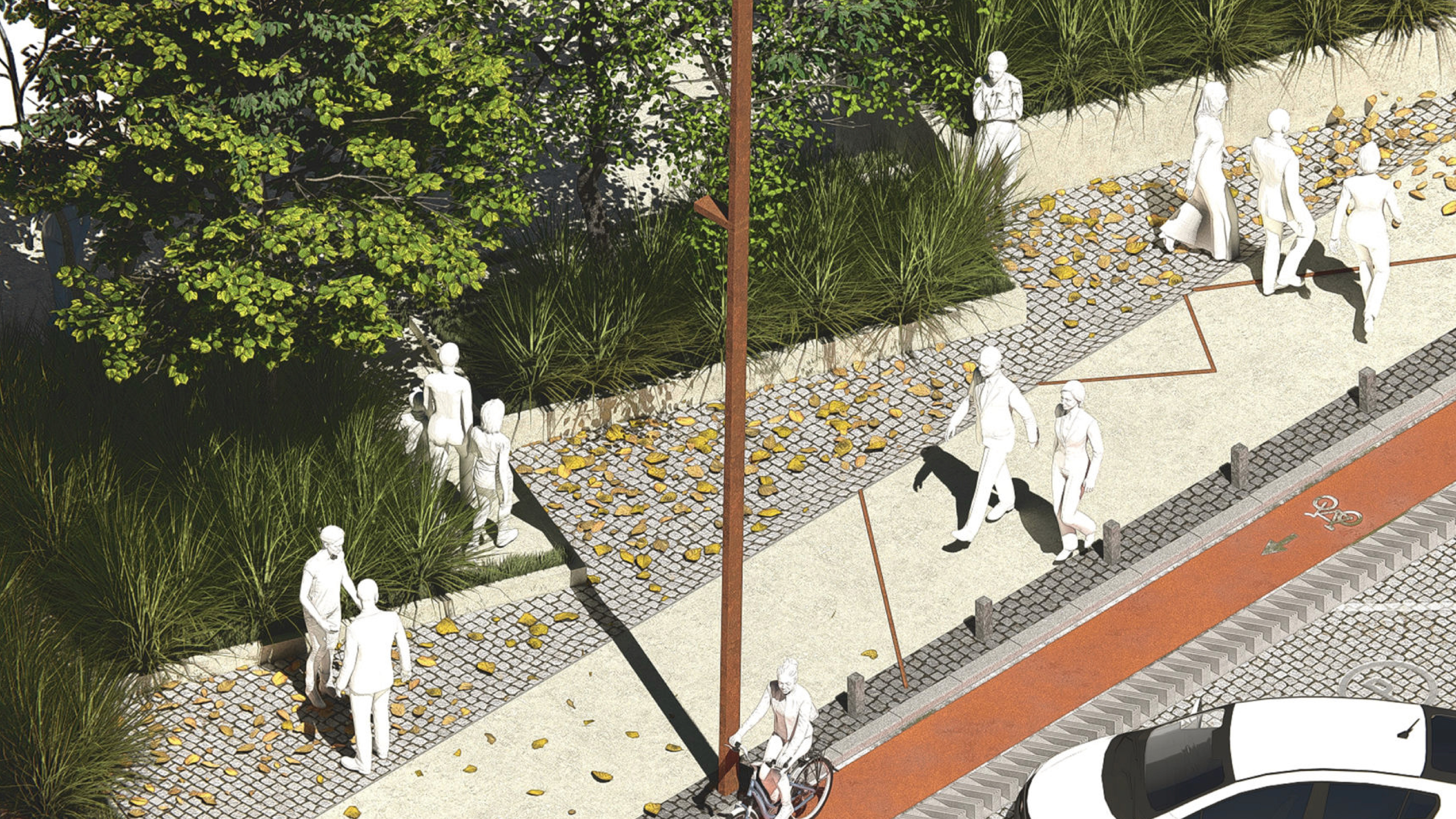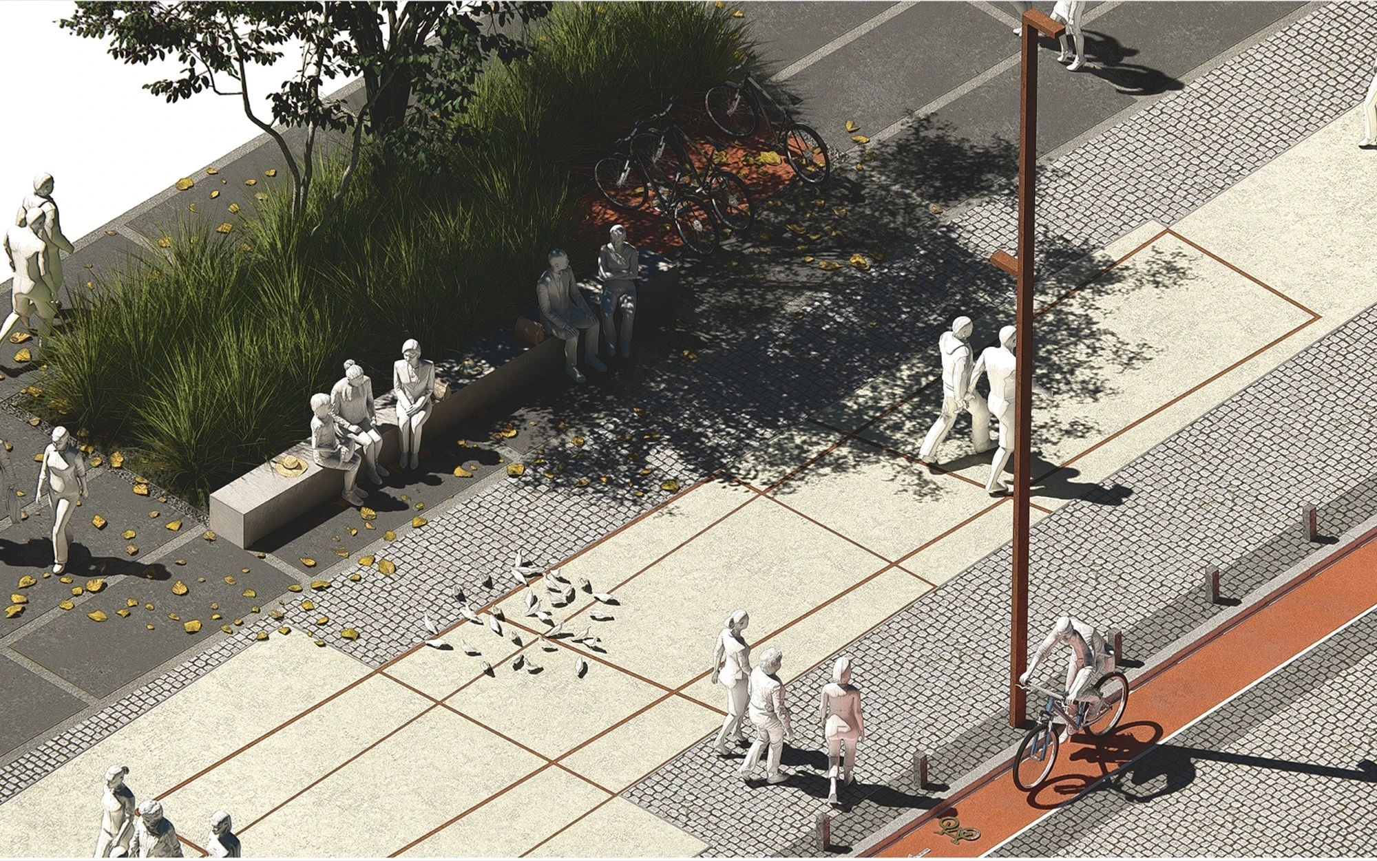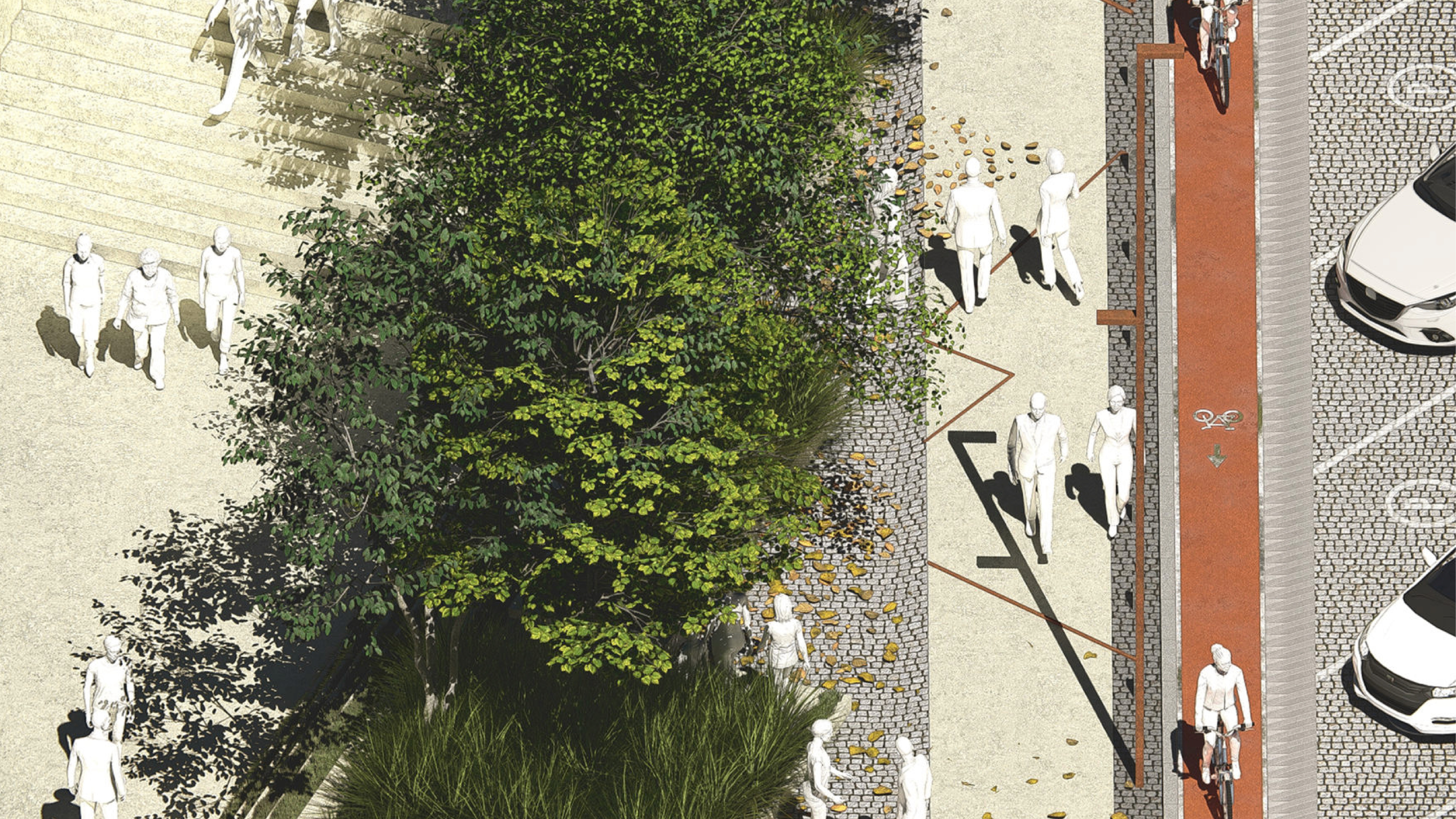 Existing trees on the street were preserved and a vegetative texture with minimal water needs was designed. At the same time, the cyclist and pedestrian arrangement was continued along the entire street.The typologies on the entire street were studied separately and the texture structure was organized in the historical area.