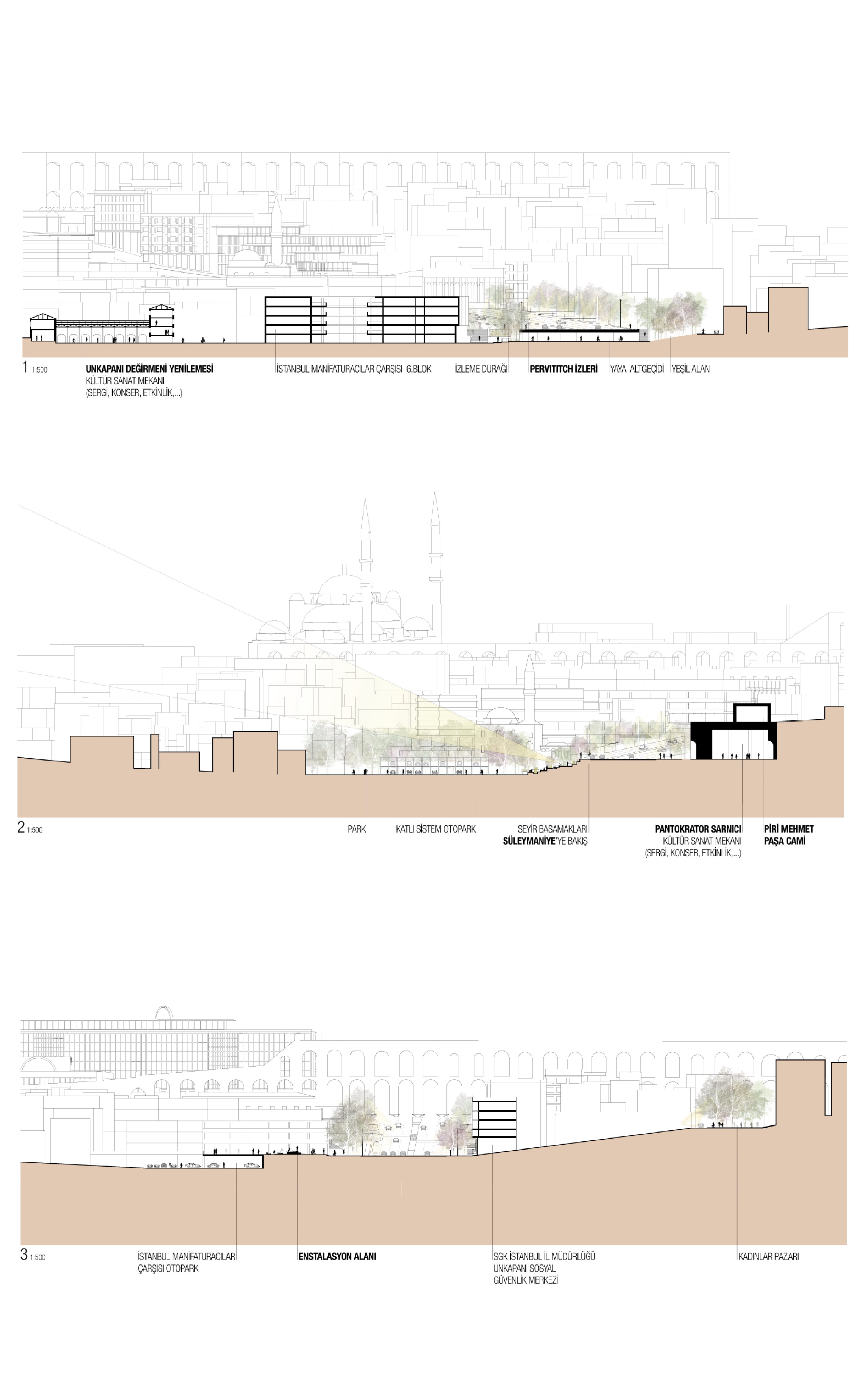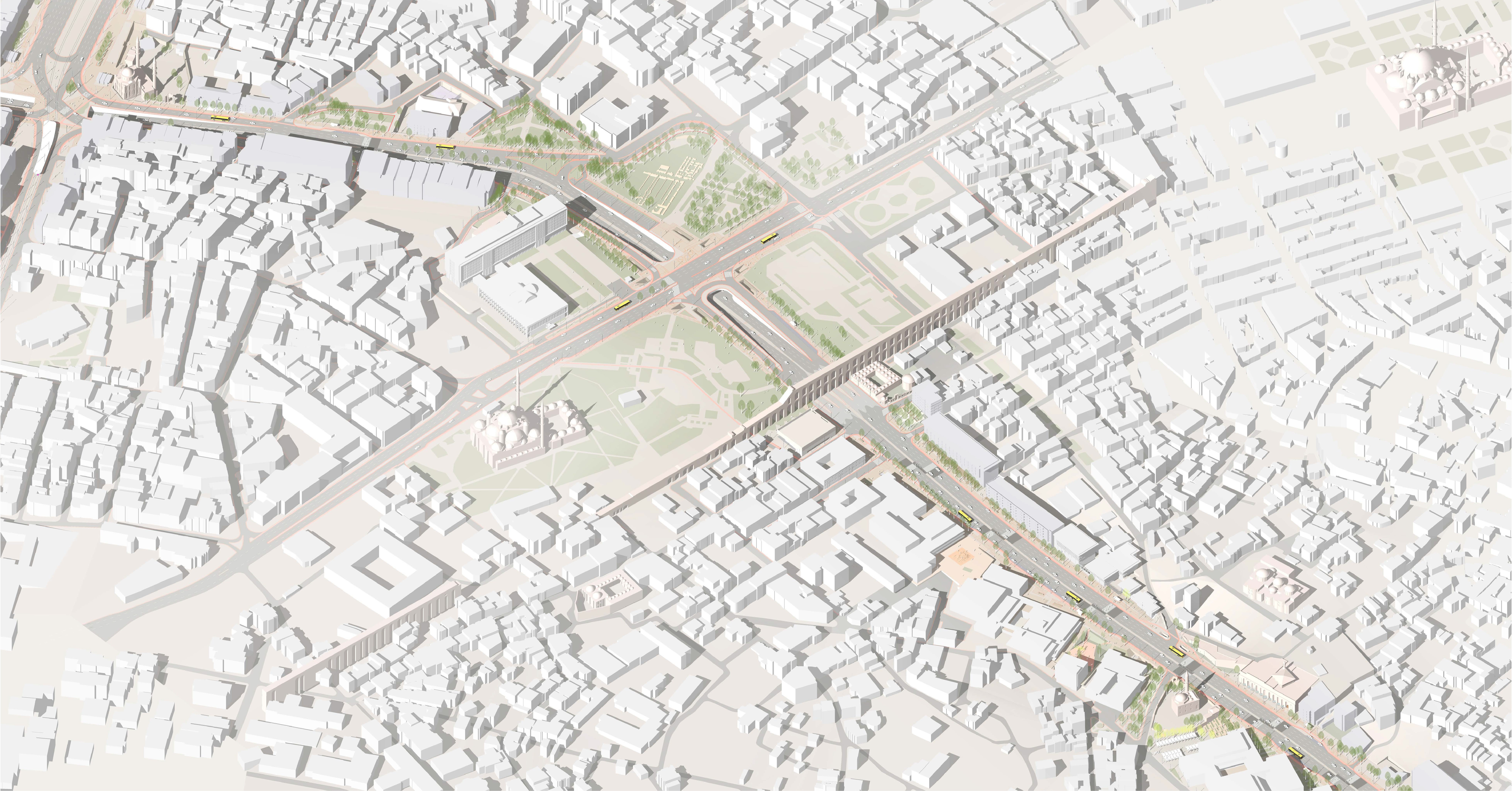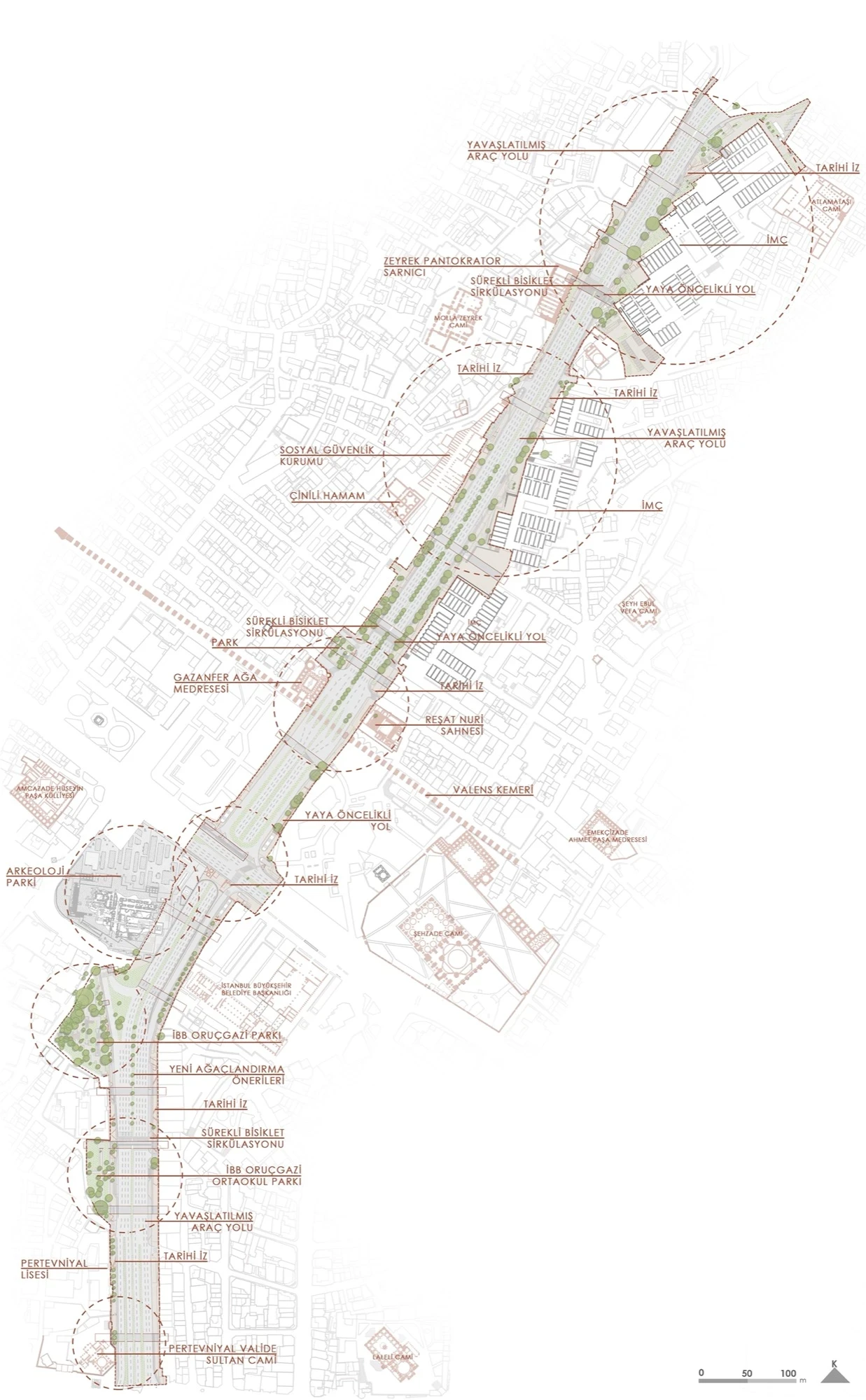Atatürk Boulevard, connecting the Golden Horn and Saraçhane, is one of the most major axes of the Historical Peninsula. In addition to the buildings of the Republican Era such as the Istanbul Drapers Bazaar, Sedat Hakkı Eldem’s SGK building, and the Istanbul Municipality Palace on the boulevard, the Valens Aqueduct, St. There are important Byzantine period heritages such as the Polyeuktos Church. The design, which prioritizes continuous pedestrian and light vehicle circulation along the boulevard, also reflects historical layers such as the old Pervititch map lines onto the ground.