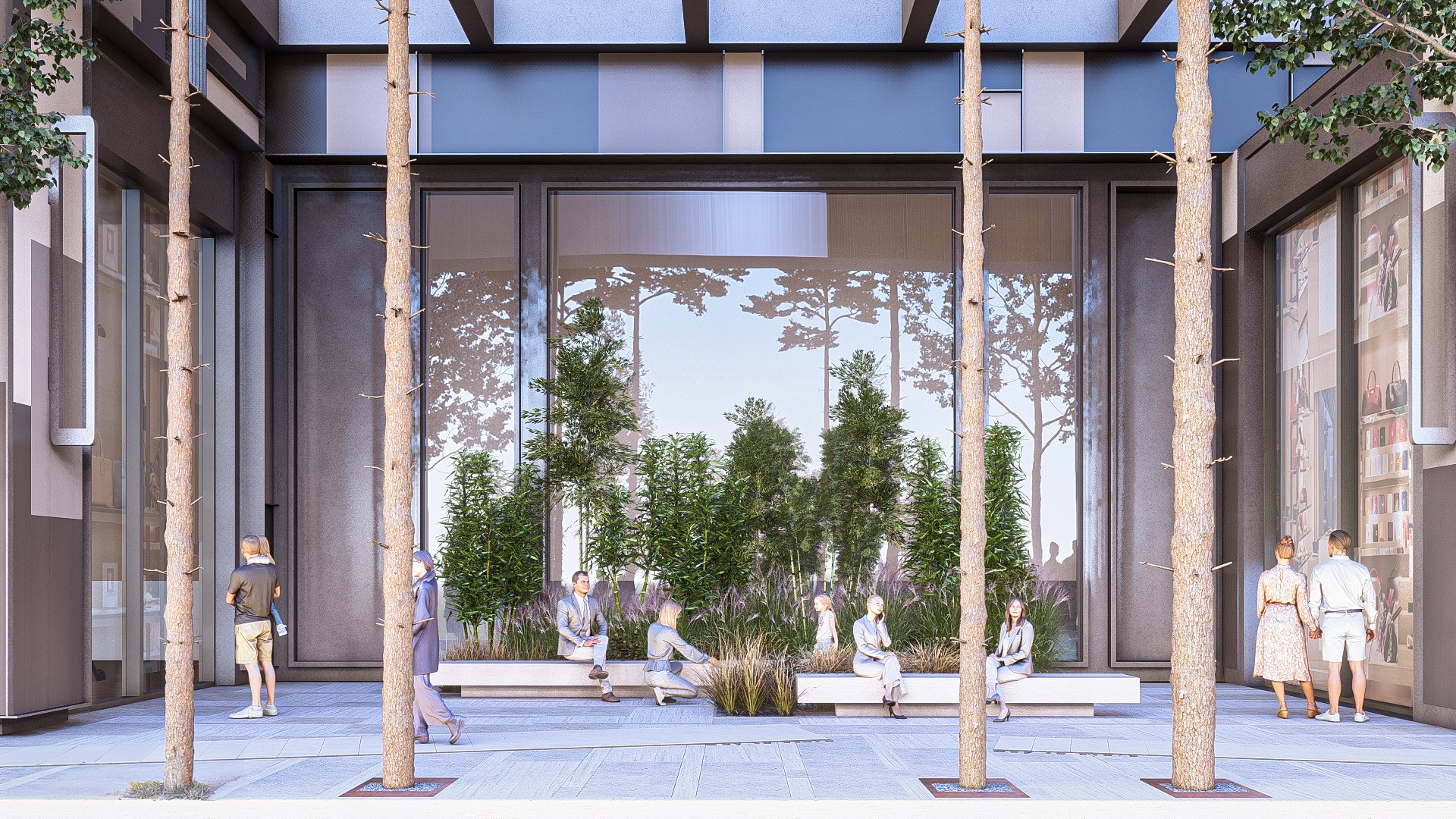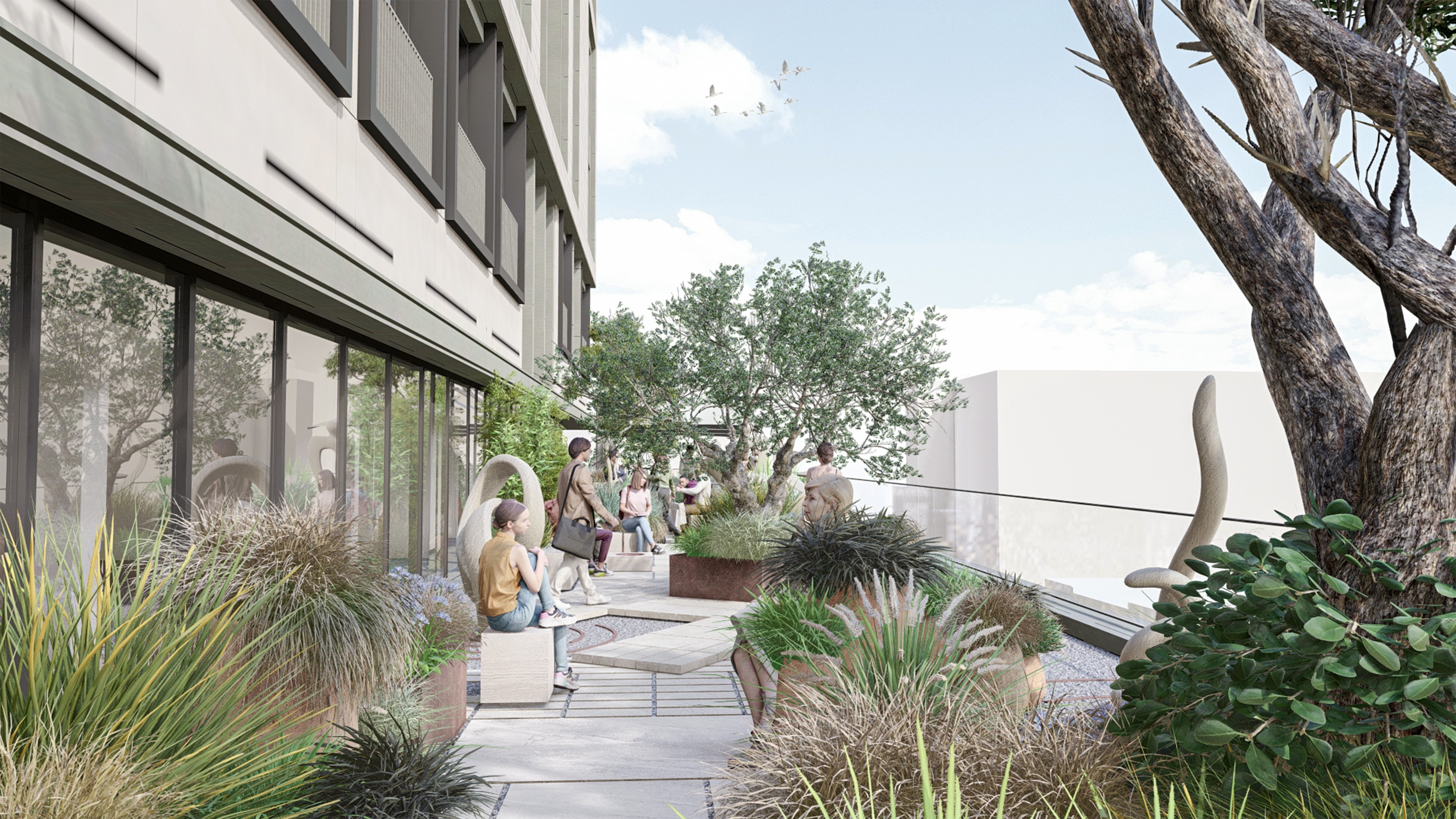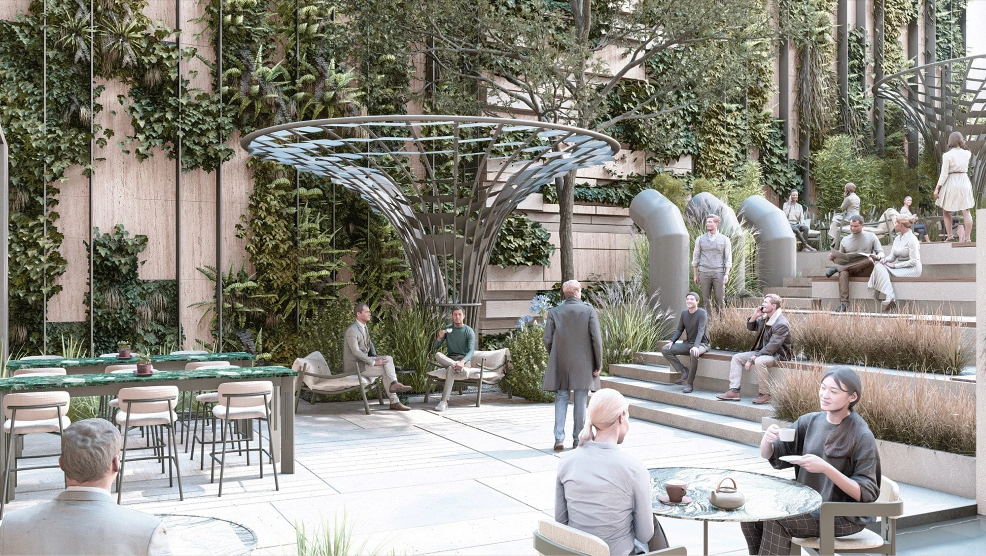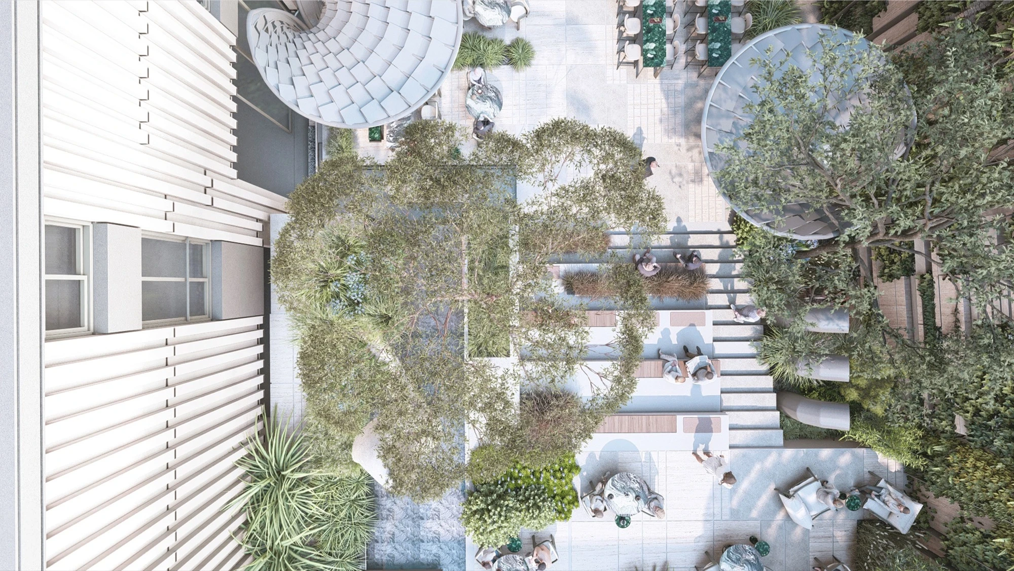 The terrace area has been shaped with hard landscape elements floating on a gravel system placed over a steel structure, which define the flow axis of the space. Additionally, the green texture of the area has been created using various planters.