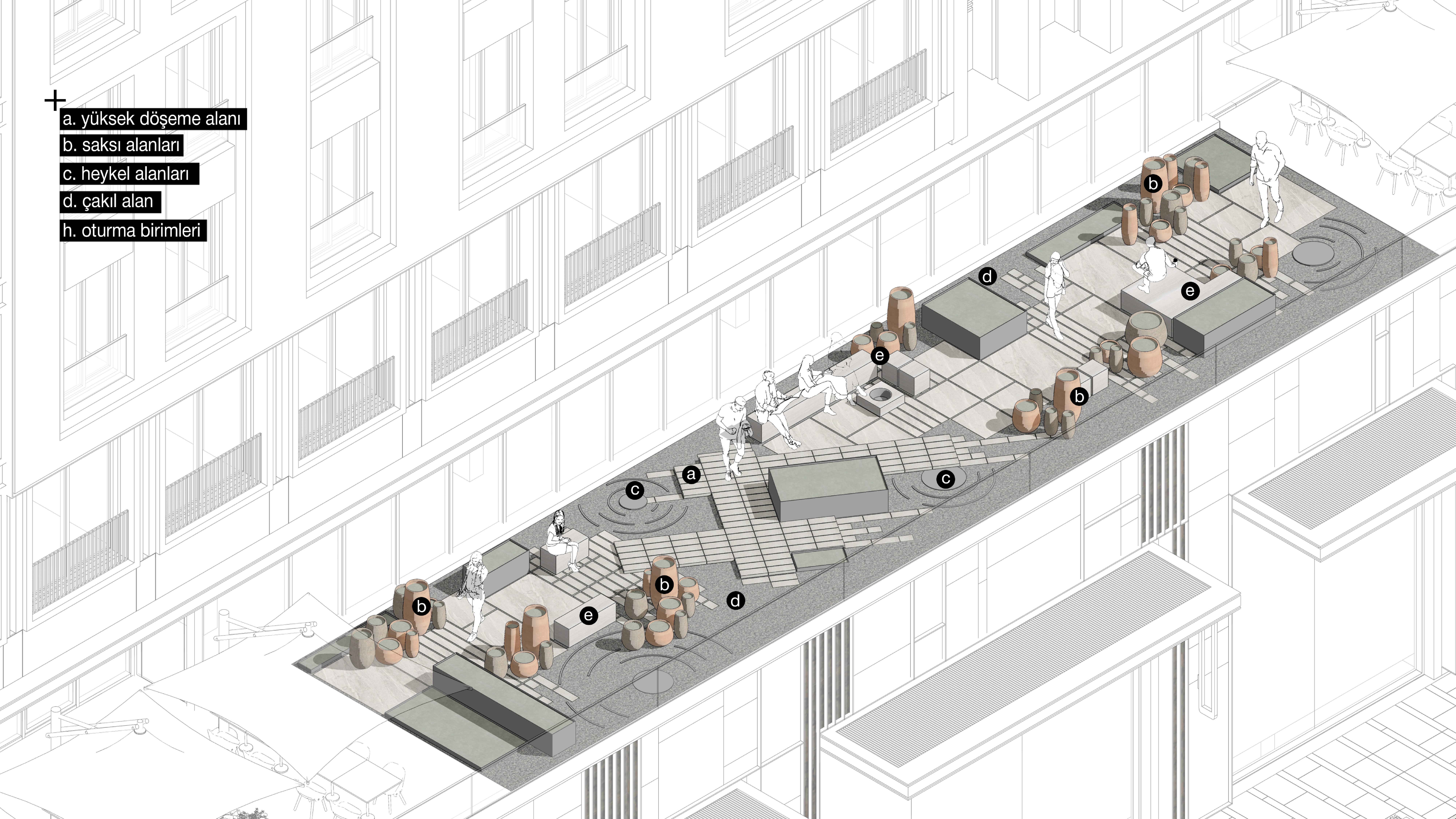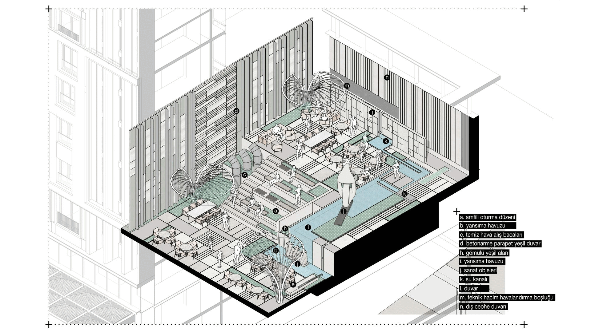 The amphitheater layout designed by utilizing the existing elevation difference in the hotel courtyard creates a space with high atmospheric perceptuality with the lower level - upper level relations, wall relations and modular understanding. The design of the deaf walls to create a green interior façade, sculpture effects, the presence of water, designed hard floor and landscape relations, the effect created by the eaves, the amphitheater seating arrangement creates a central courtyard atmosphere that offers flexible usage opportunities. In the design of the area located at the terrace connection point, a dynamic fiction has been created with the green texture that strengthens the effect between the two regions, and the design of a guiding defined axis.