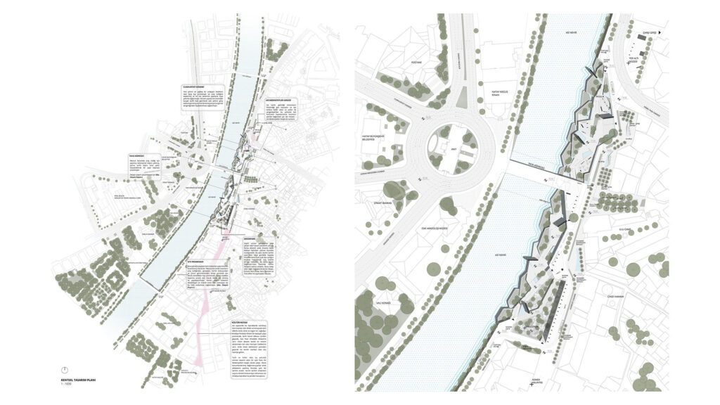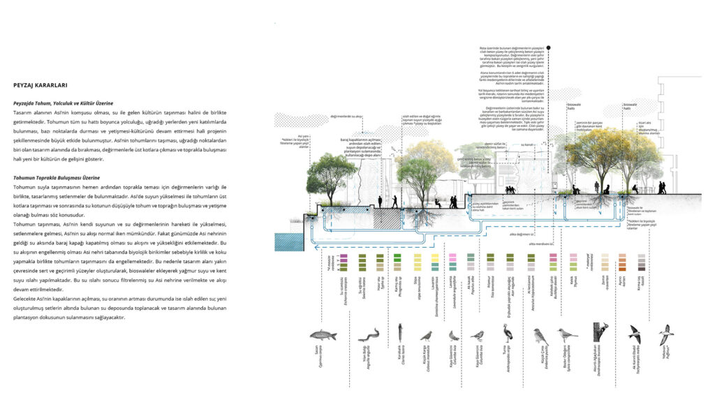 Asi ile Antakya’nın ilişkisinin son derece hırpalanmış durumda oluşu ve yüzlerce yıldır medeniyet taşıyan suyun durgun ve kokar vaziyette bulunuşunun analizi ile, projeyi sınırları tariflenmiş bir alan olarak değil; suyu örgütlemek, suyu akar ve sağlıklı hale getirmek ve suyun akışı ile taşınan tohumların da tasarımın bir parçası haline gelmesi hedeflenmiştir.
