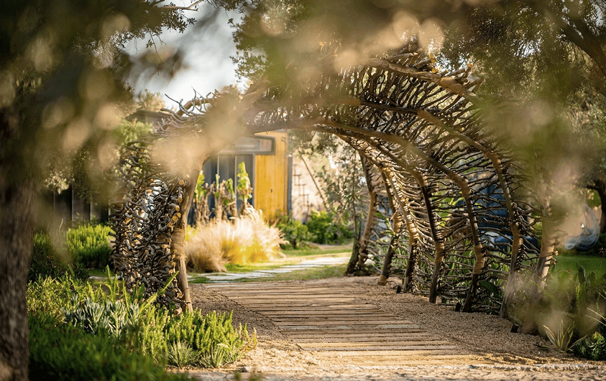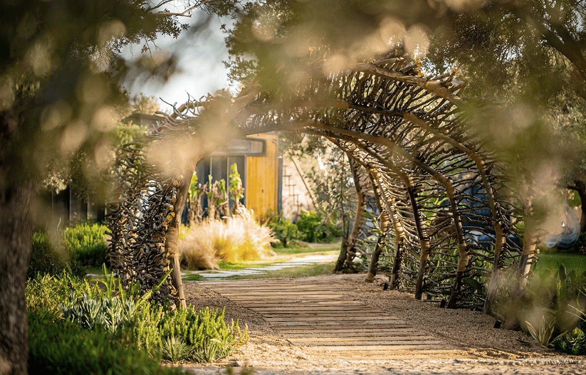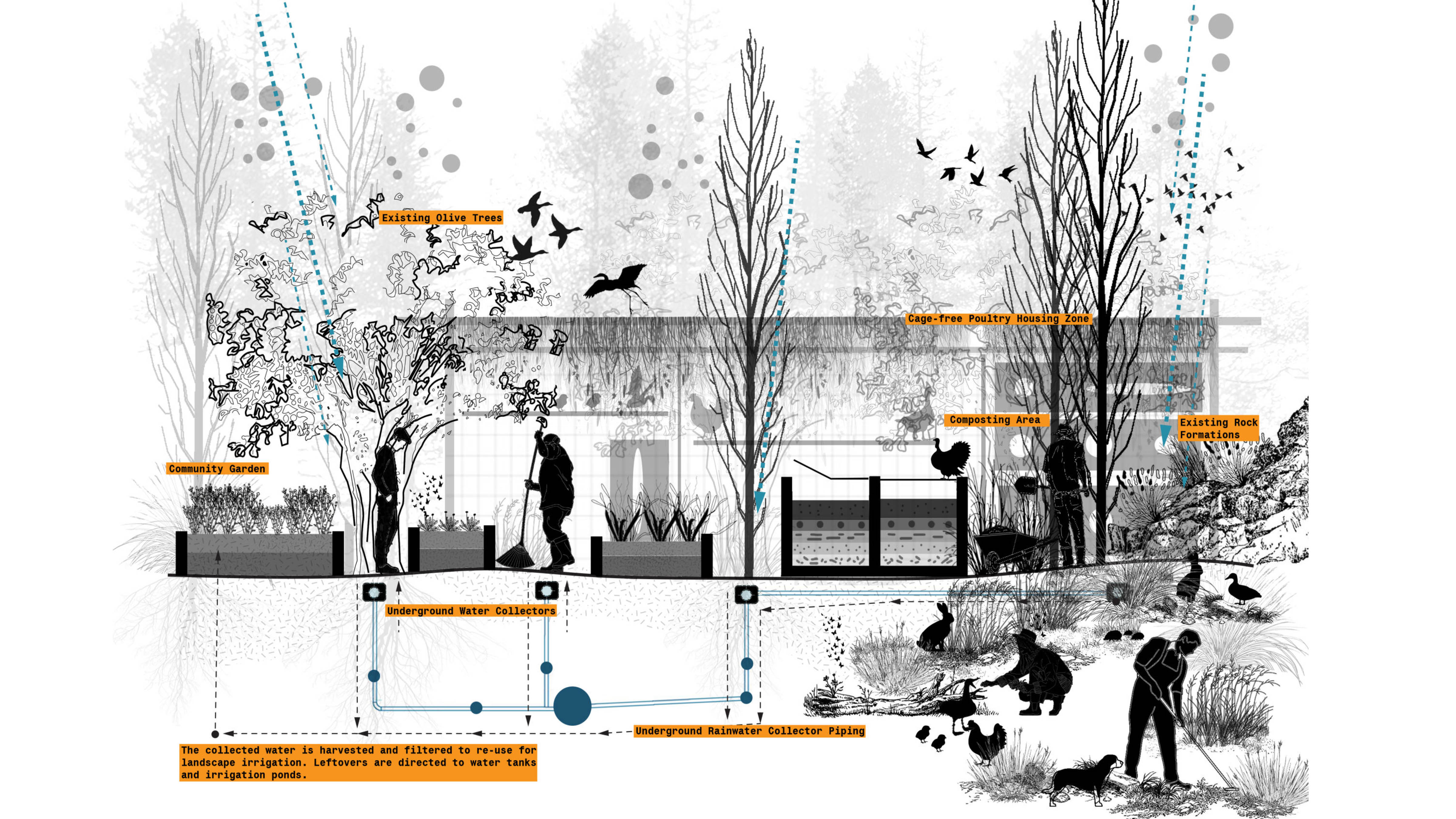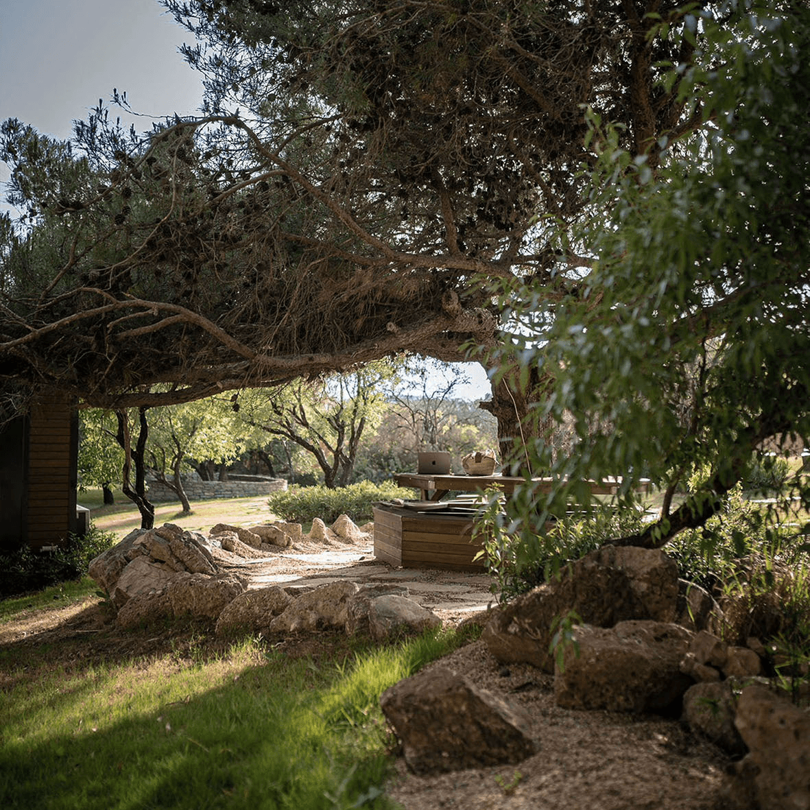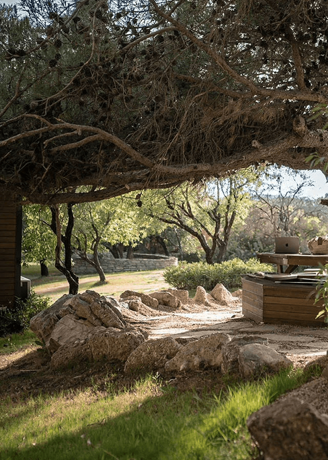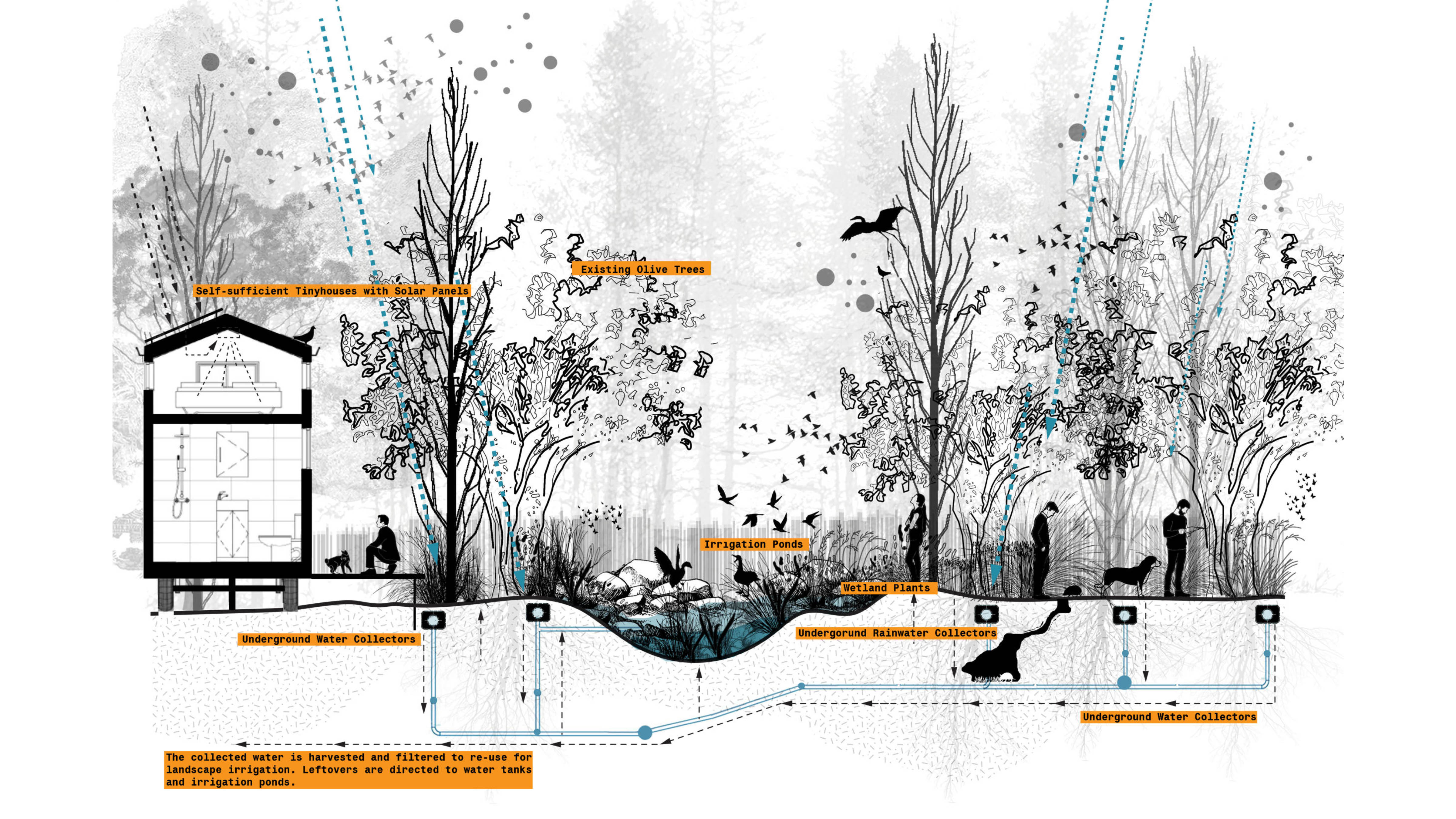The BBTiny House facility, located on a 13,000-square-meter plot in Datça, aims to introduce a new design perspective to the Aegean region through water management, material usage, and a sustainable operating system. The preservation of all rocks, almond, and olive trees within the area, the development of water collection and recycling strategies, and the integration of waste-compost utilization into the system have been prioritized.
