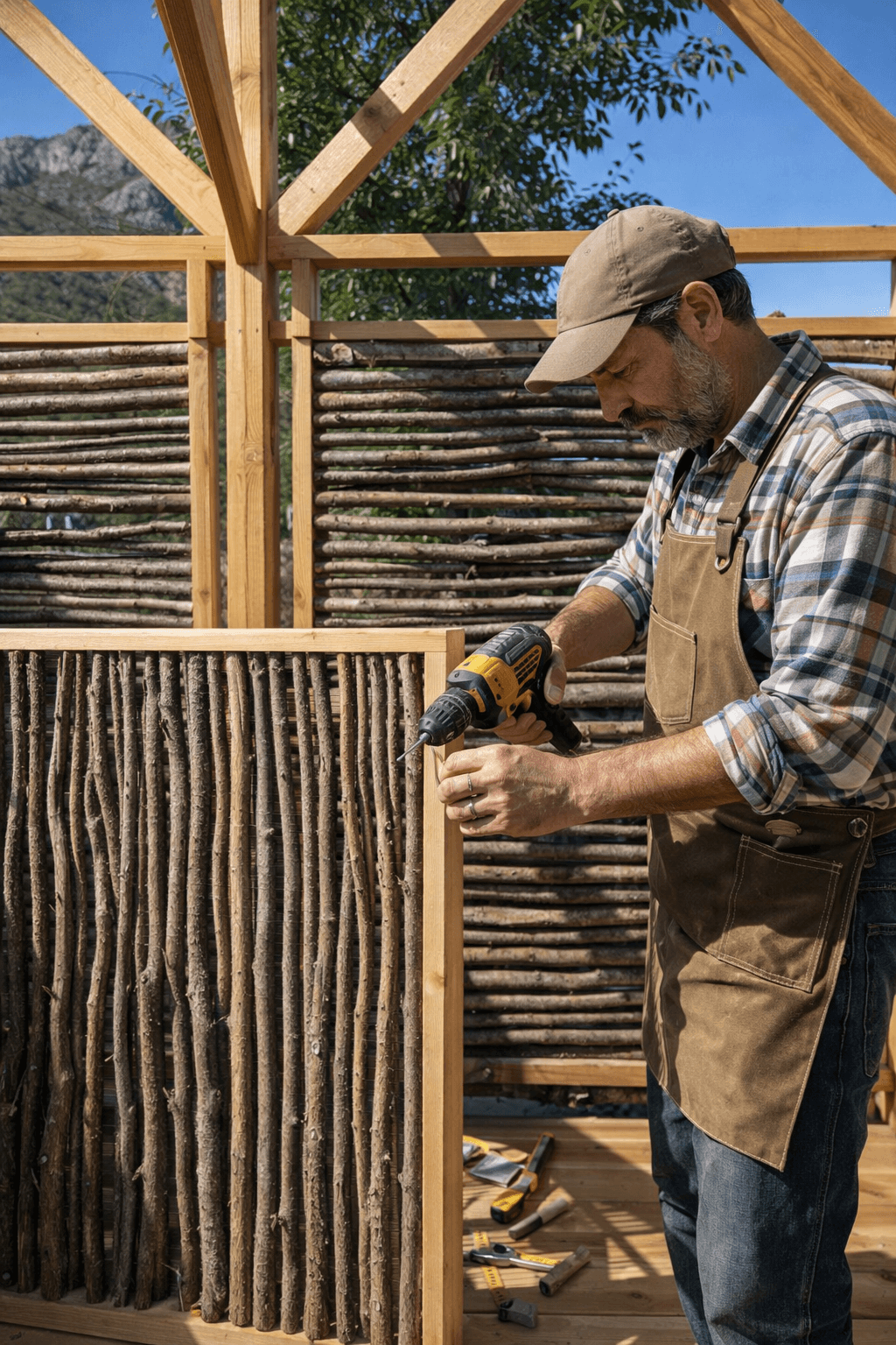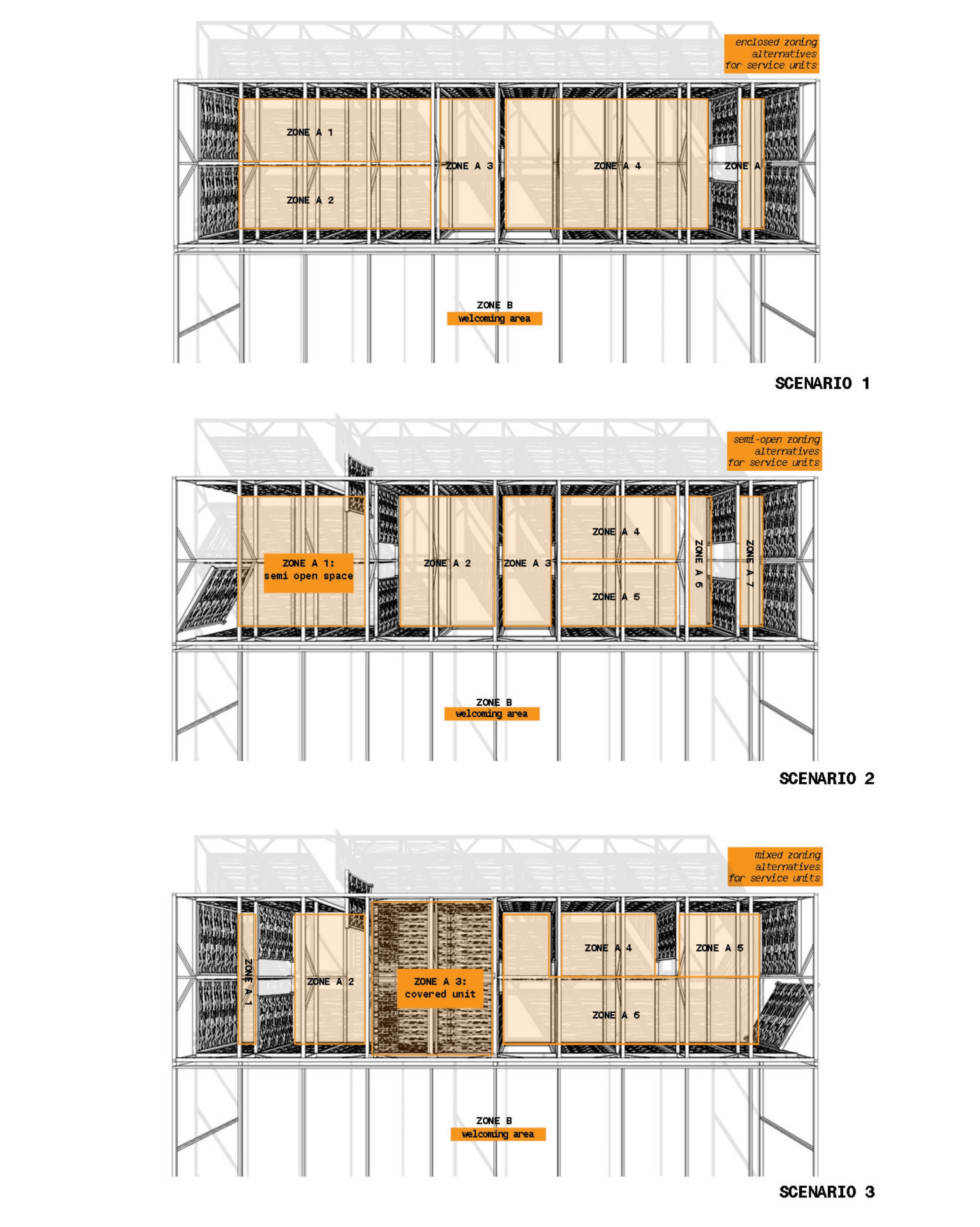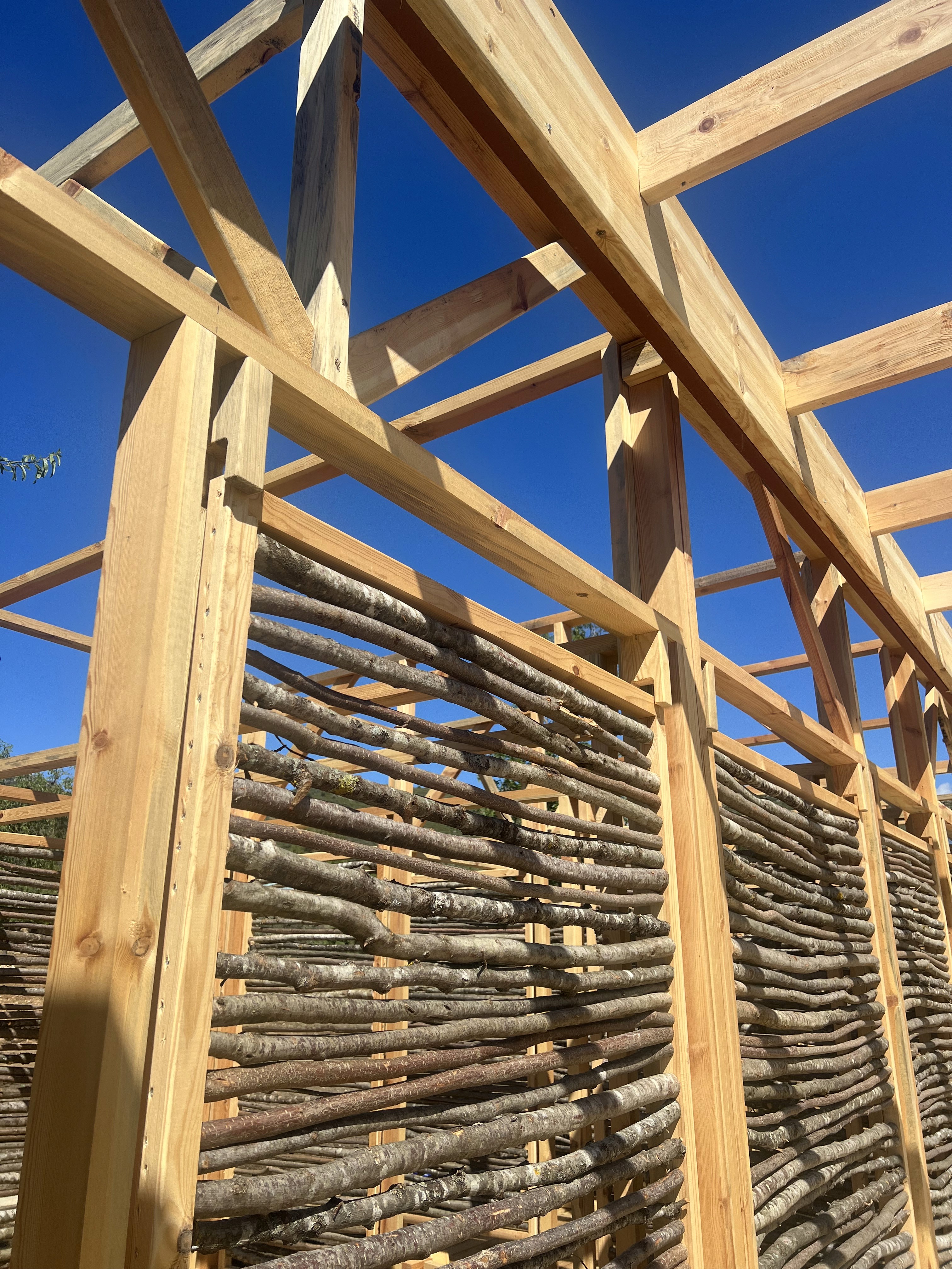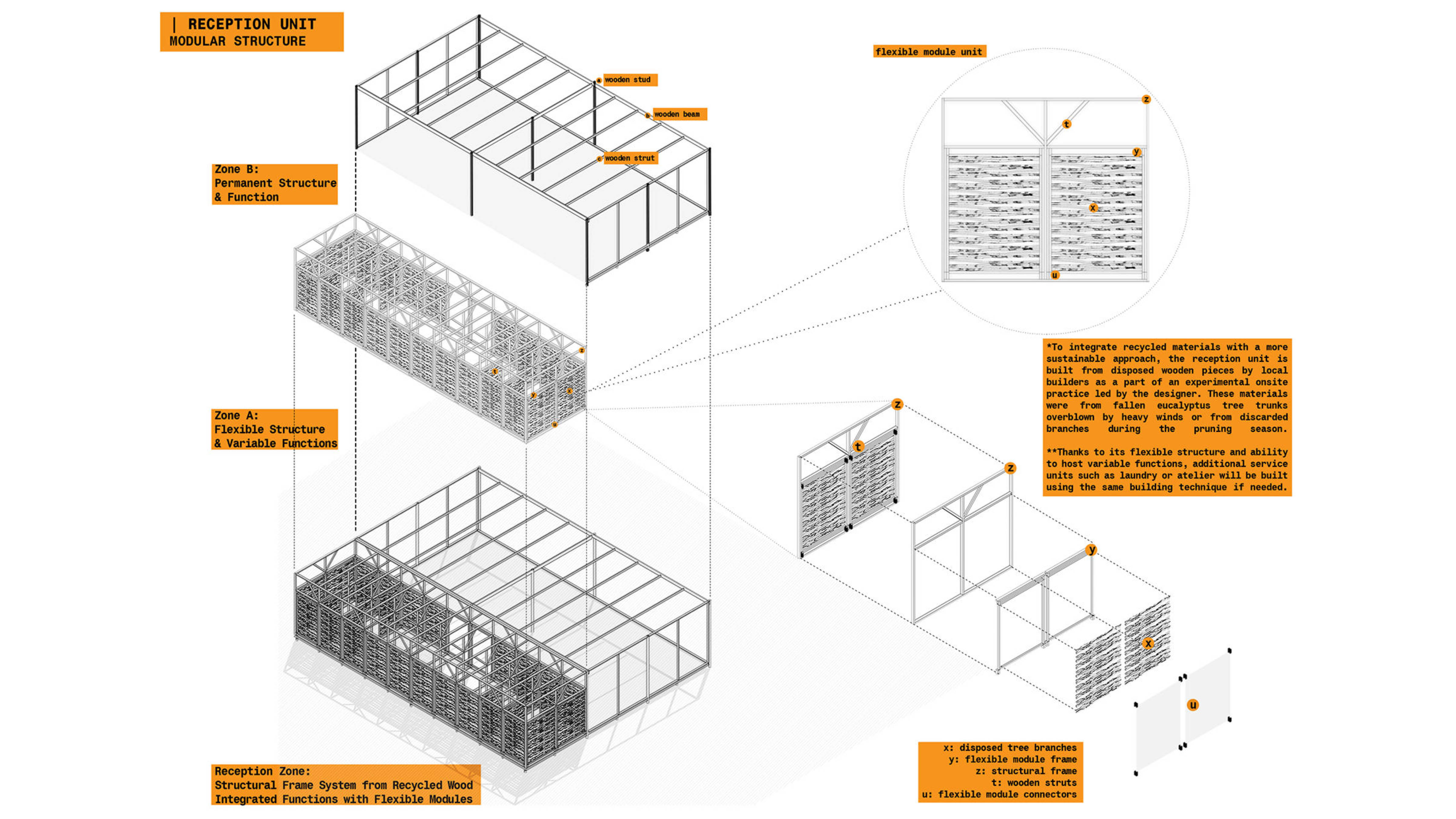 In the area where 13 EcoTiny Houses are located, there is an adaptive structure made from waste branches and frames, serving as a reception, workshop, laundry, office, and restroom. This structure changes its layout based on the seasons and user needs.