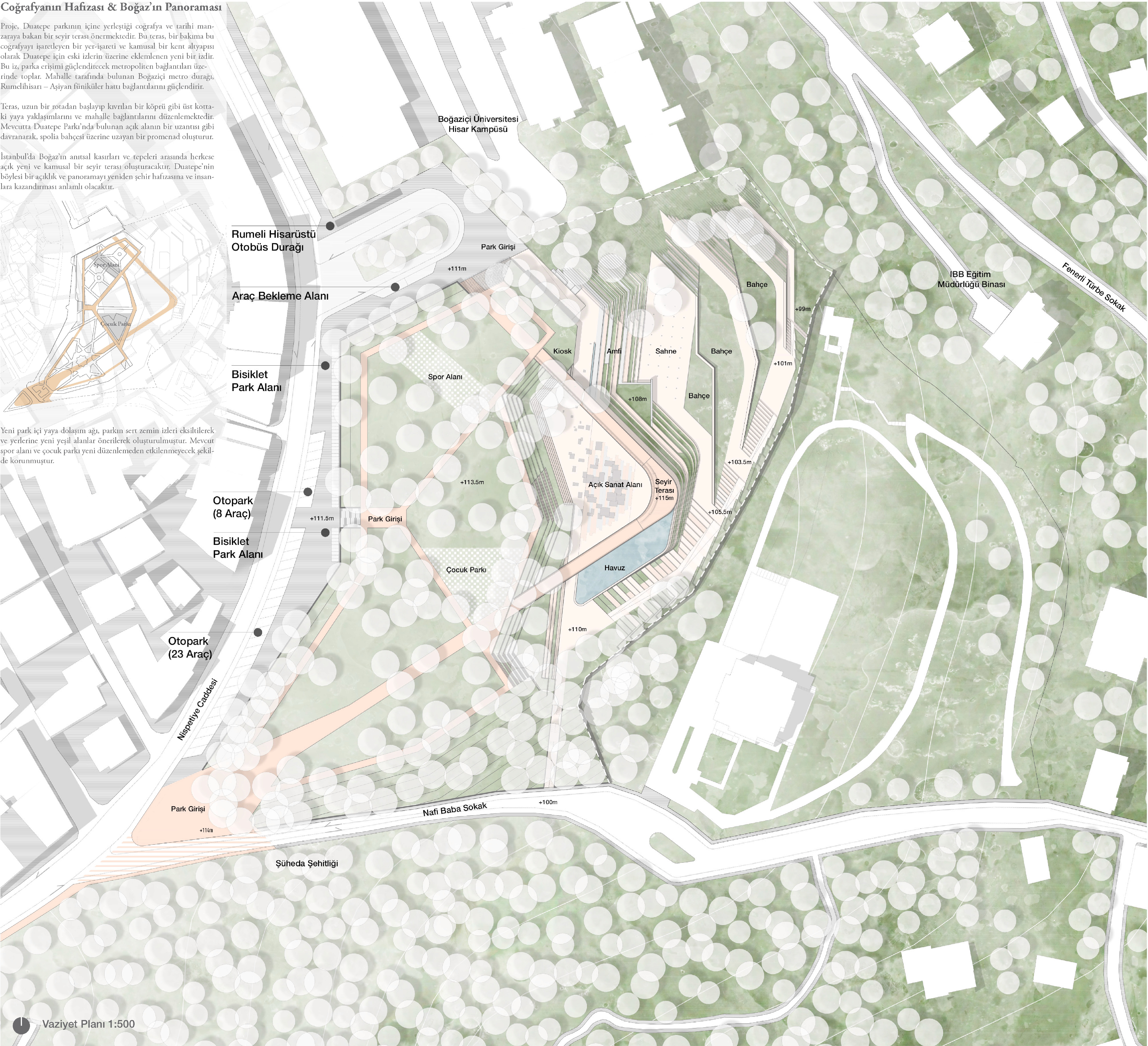 Proje, Duatepe’ye seyir terasının üzerine iliştiği, geniş bir bahçe olarak yaklaşmaktadır. Arazinin alt kotlarına doğru giderek artan bitki örtüsü bahçeyi kaplar. Dağınık gezinti yolları boğaza uzanışı ve doğal olanın içerisinde kaybolmayı temsil eder. Doğanın bir taklidi olan Duapark Akdeniz ve Karadeniz topraklarının iklim kesişme noktasında olması sebebiyle iki iklime ait bitki örtülerini de kendinden barındırır.