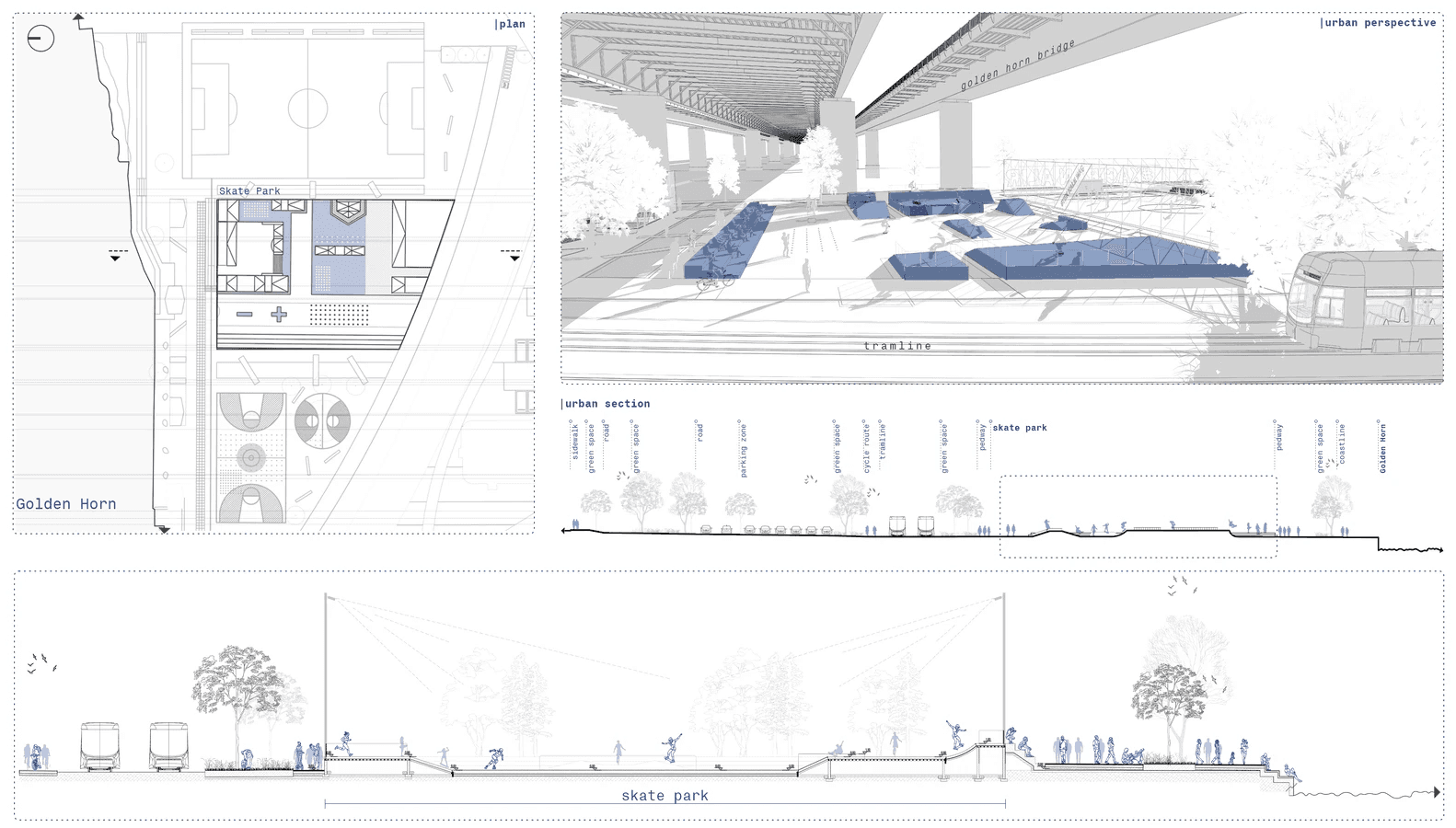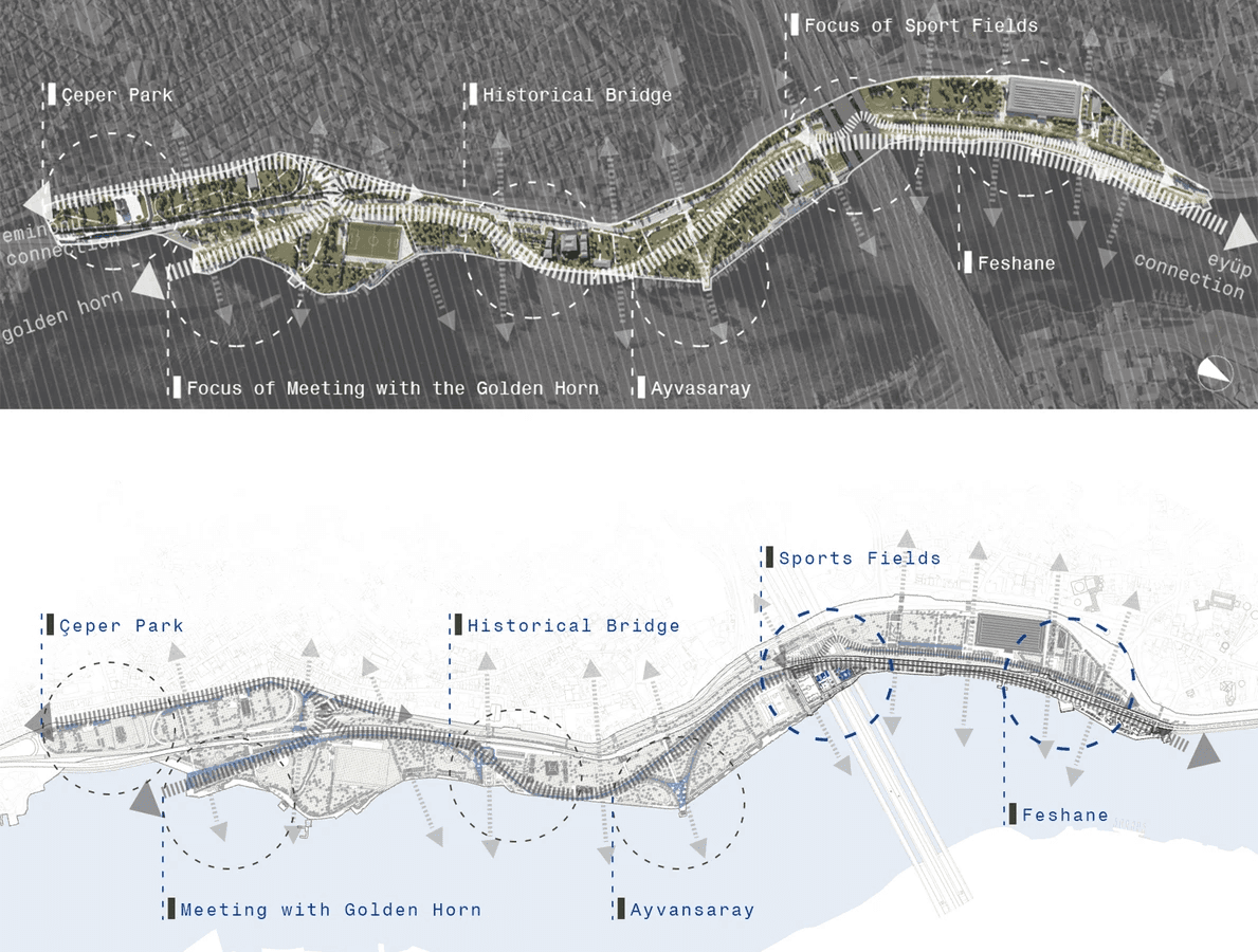 Önerilen akışkan kurgu, kıyı boyunca kentsel sürekliliği sağlarken, şehri de kıyıya entegre eden temel bir yaklaşım sunmaktadır. Proje, klişe bir söylemden öte bunu zaman zaman mimari elemanlar zaman zaman peyzaj yaklaşımları ile üst ölçekten alt ölçeğe inen bir tutarlılıkla gerçekleştirmektedir. Proje bağlamında bahsedilen süreklilik ; kentsel ölçekte yeşilin sürekliliği, tarihi dokunun sürekliliği, durağan bir peyzaj elemanı olan “suyun” ve “manzaranın” sürekliliği iken, alt ölçekte yayanın sürekliliği, bisiklet yolu sürekliliği ve ulaşım-yaya ilişkisinin sürekliliği olarak yer almaktadır. Önerilen odaklar, genel kurguyu besleyen ve kendi özelliklerini genel kurgu içerisindeki konumlarından alan eylem alanlarıdır. Aynı zamanda Haliç Spor Parkı, kent-su ilişkisini onarmaya, yeniden kurmaya çalışmak ile birlikte çok fonksiyonlu zemin kullanımları önermaktedir. Kıyı ile olan kot farkları dinlenme-izleme-bekleme işlevi görecek şekilde şekillendirilmiştir.