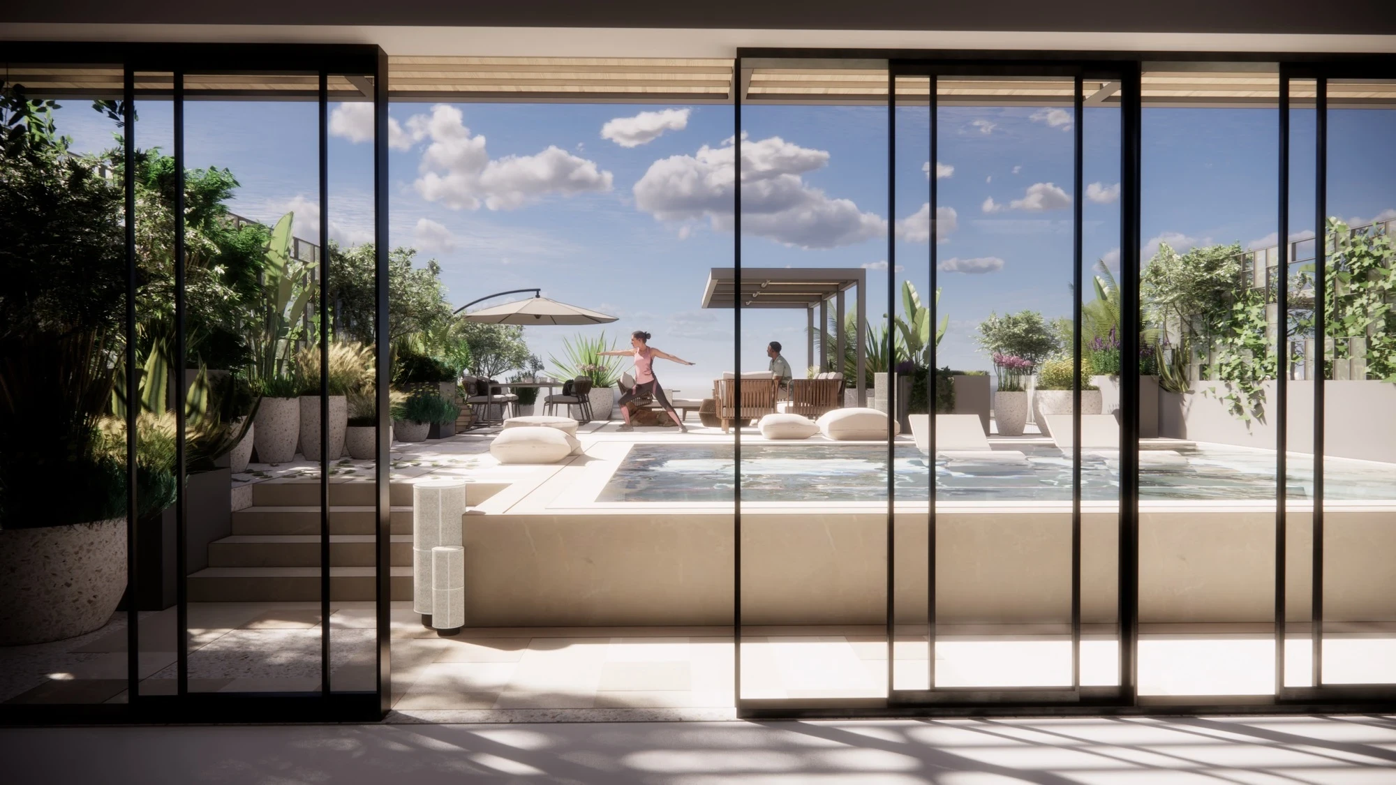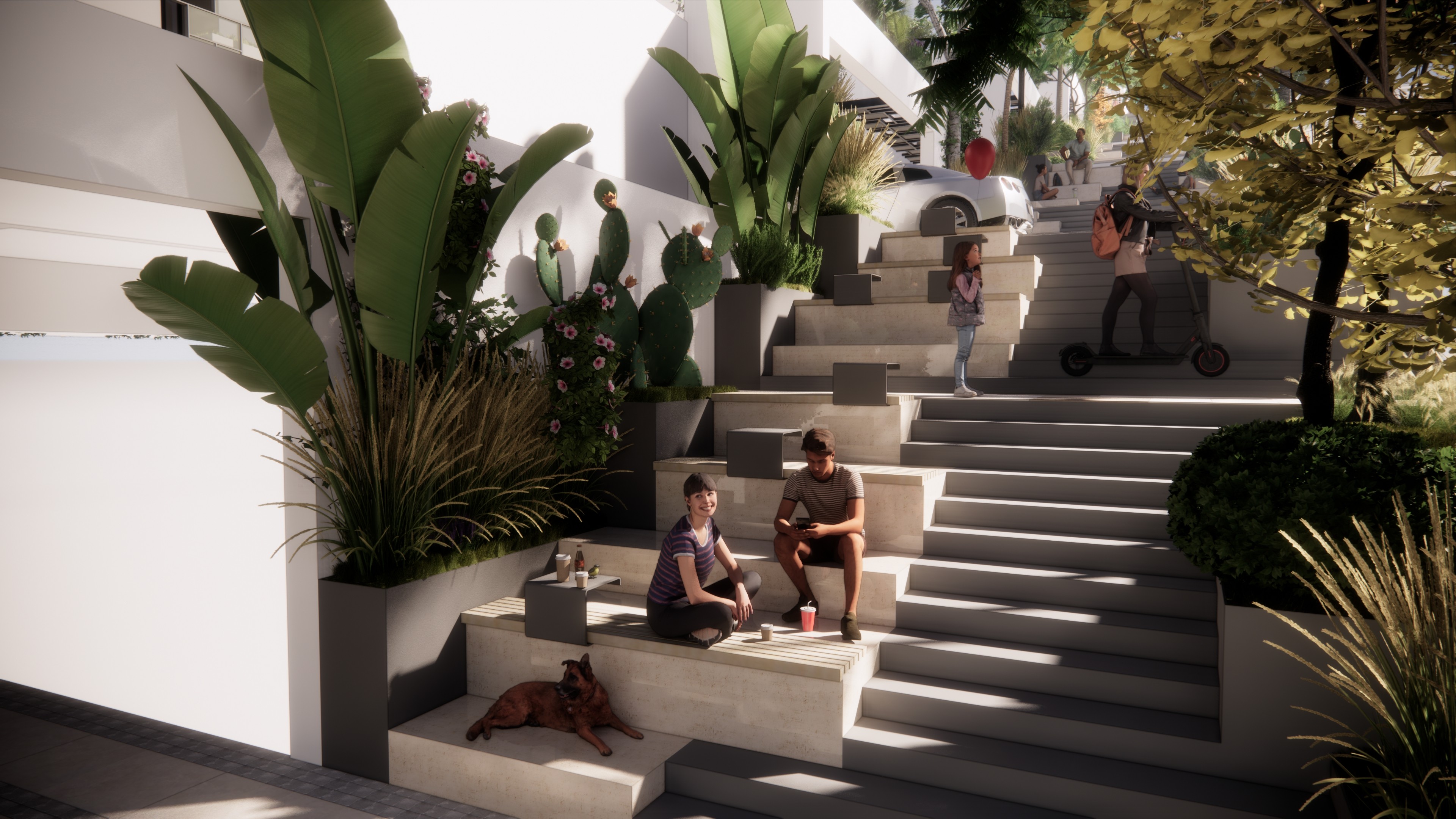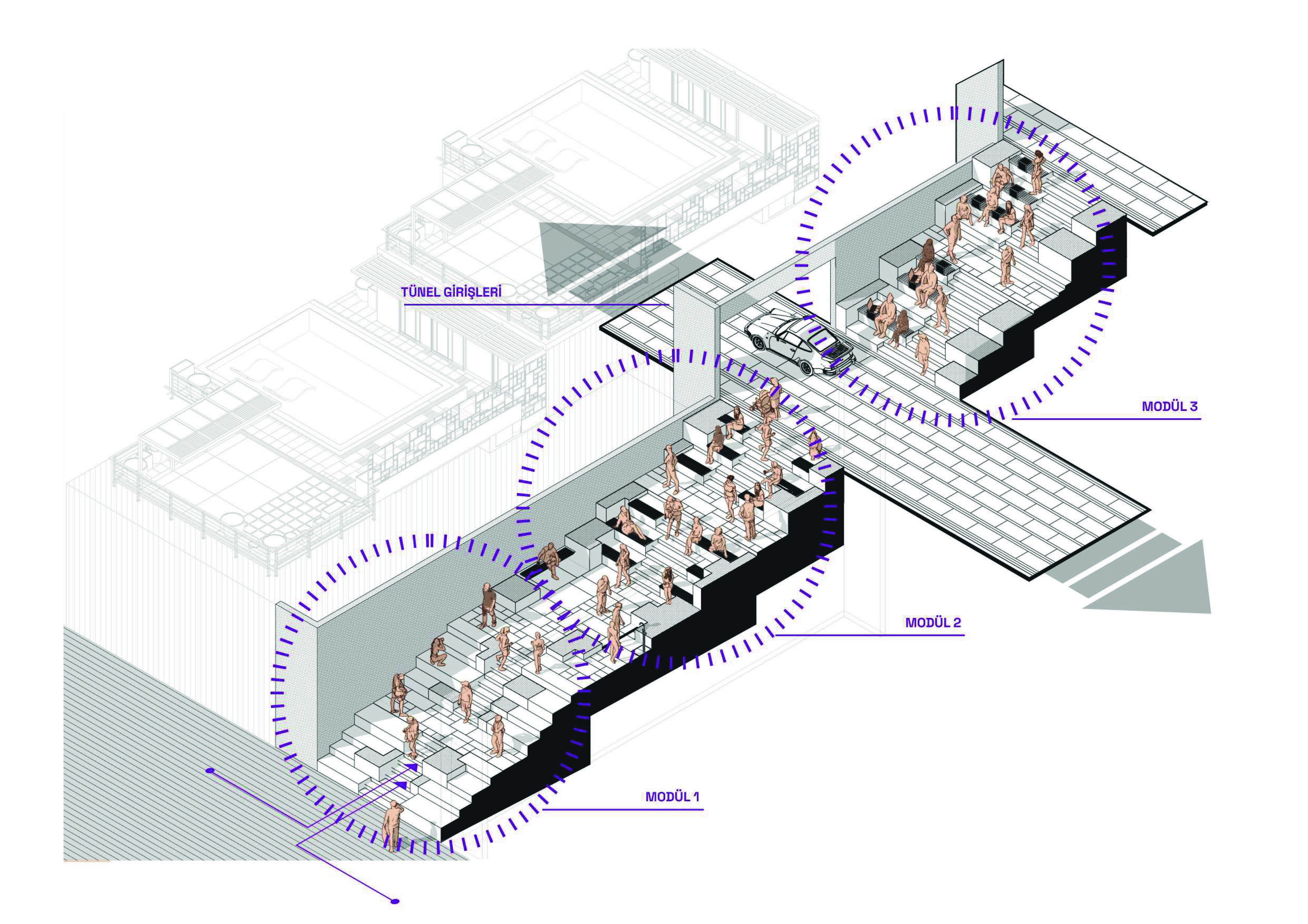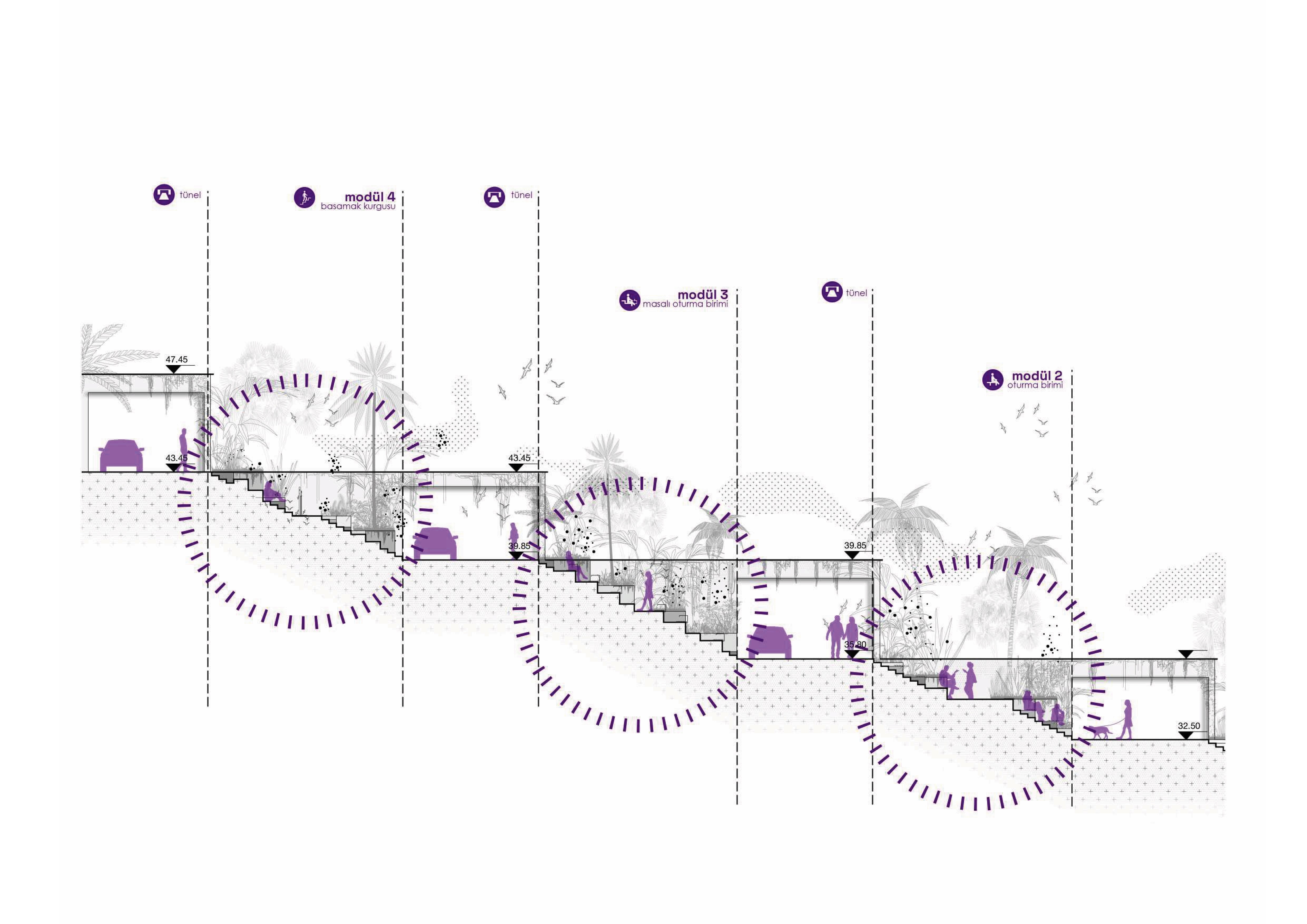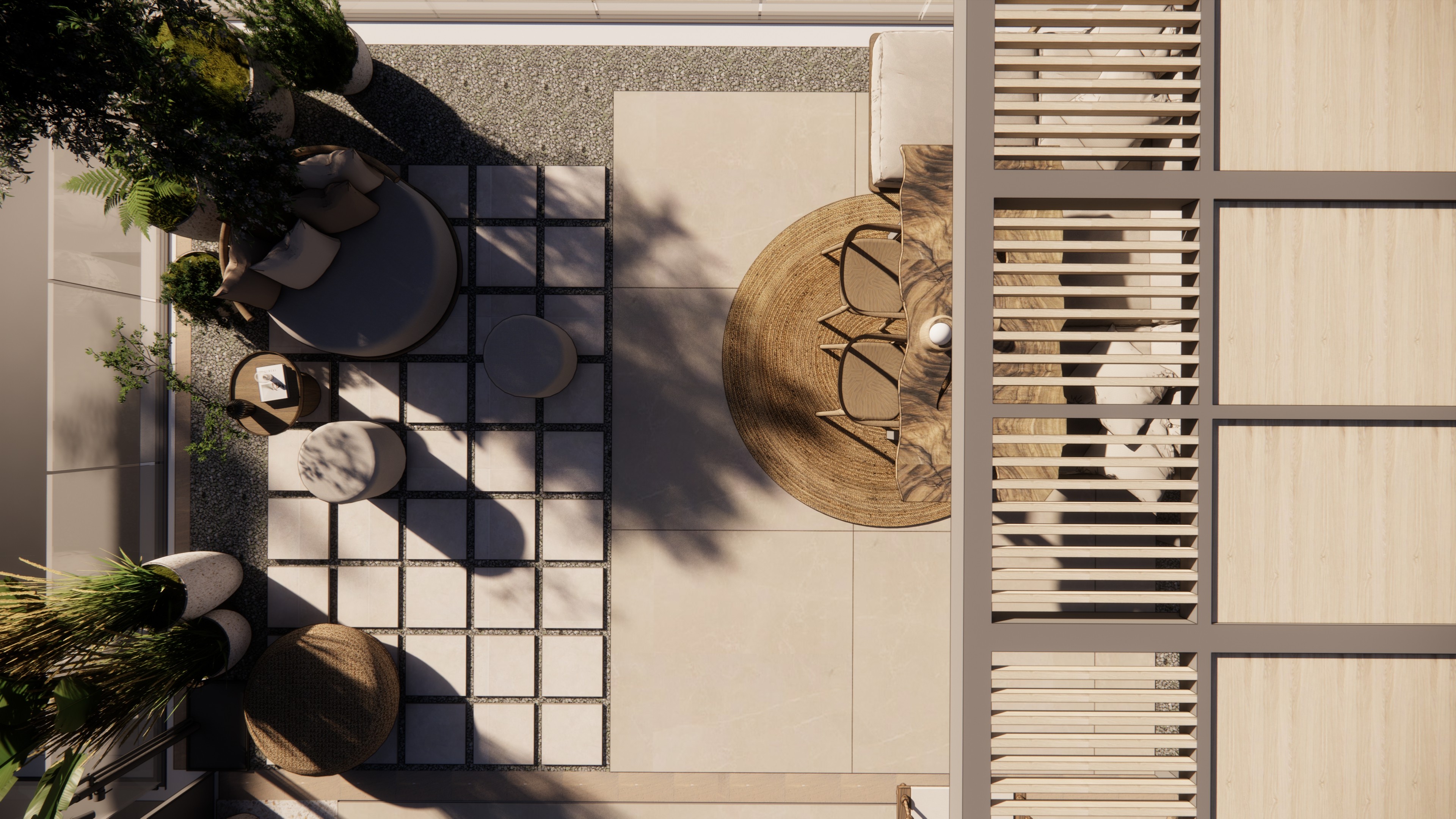 The existing modulation system in the architectural decisions has been applied in the hardscape landscaping to suit different functions. By designing the terrace as an extension of the residential living spaces, an interior-exterior connection is established while also proposing a dynamic modular system that defines personal spaces.