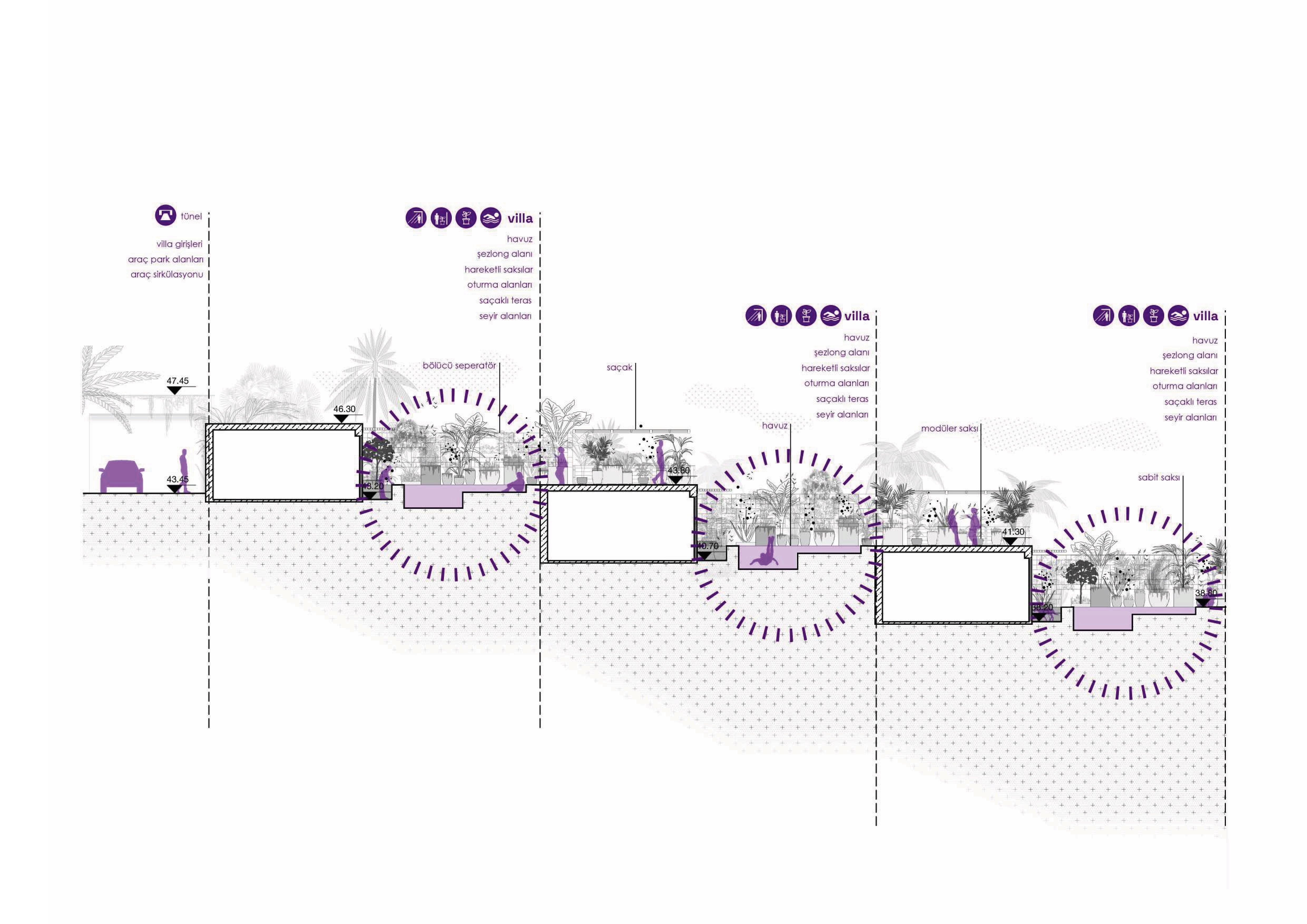 It is a comprehensive project consisting of the modular design of the common axis, which is an important area for access to residences, and the shaping of the terraces located at prominent landscape points, where structures are layered on the topography in the Çeşme region.