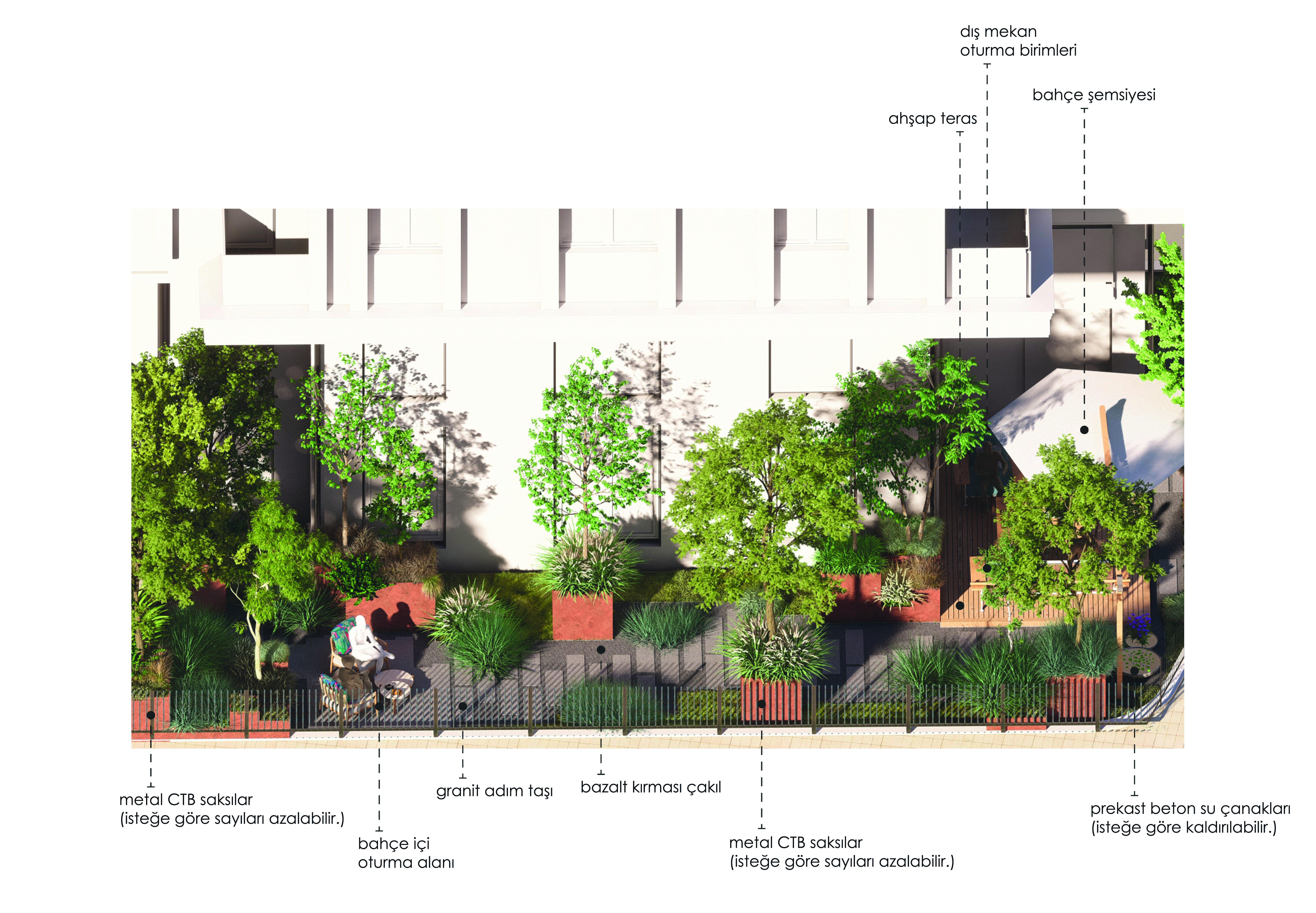 In common areas, gyms, cafes, sports fields, children’s playgrounds, open, semi-open and closed spaces are also designed. Special use terraces with raised metal pots and wooden pots of different sizes have been designed in residential gardens. By taking advantage of the elevation differences, the gardens were separated from each other and from the circulation axes within the site with mesh dividers, allowing the green texture to continue vertically.