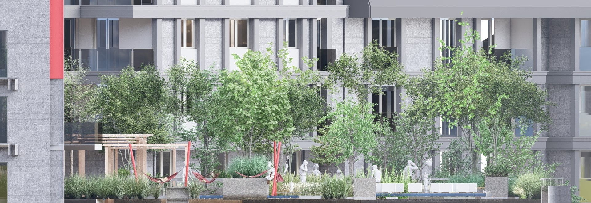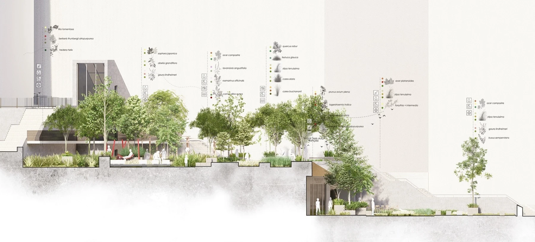 In the project where approximately 9000 m2 landscape area of a 18000 m2 public housing and office complex in Istanbul Üsküdar was designed, the buildings located on a sloping land create a common-use courtyard and terrace gardens connected to the residences at different elevations around the building.