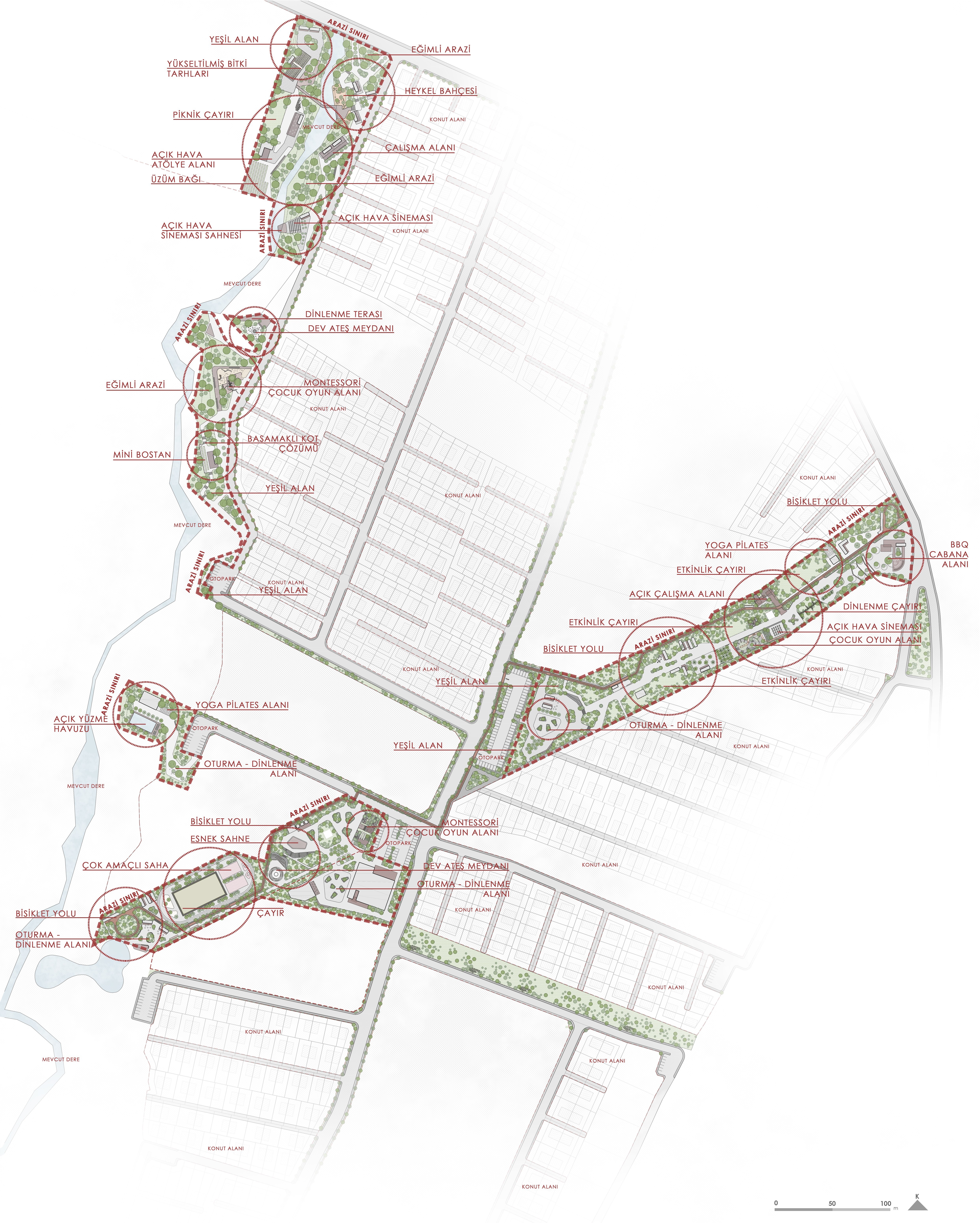 Araç, yaya ve bisiklet sirkülasyon aksları ile bağlanan açık-yarı açık mekanlar arsa blokları arası tampon bölgelerde tanımlanmış ve zemin tipolojisi olarak doğal kaplama malzemeler betonarme imalatını minimuma indirecek şekilde karbon ayakizi düşük tutularak tasarlanmıştır